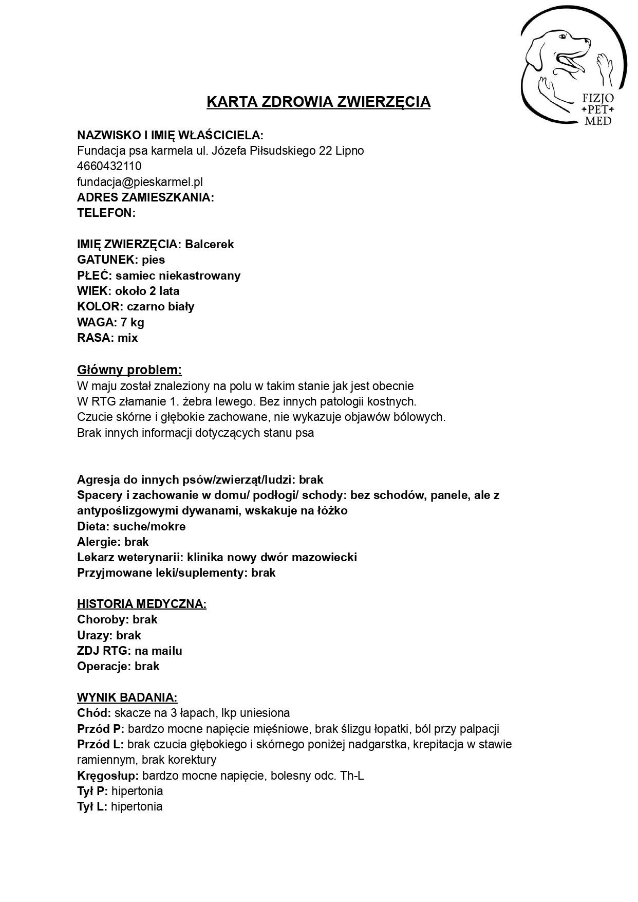 Balcerek to mały pies do adopcji. Jest młody, ma około 2 lat. Jest psiakiem uroczym, pogodnym, lubiącym wspólną zabawę, chociaż do obcych z początku może być zdystansowany. Na co dzień jest spokojny i lubi odpoczywać w swoim własnym kącie. Czasami lubi zaszaleć, jednak nie brojąc. Z powodu dawnego urazu łapki czasem zdarza mu się trzymać ją podwiniętą w powietrzu, jednak nie utrudnia mu to poruszania się, nadal pozostaje zwinnym, zaradnym i szybkim psiakiem. Wciąż powinien wykonywać ćwiczenia na łapkę, jednak szybko robi bardzo duże postępy. Jest wykastrowany.