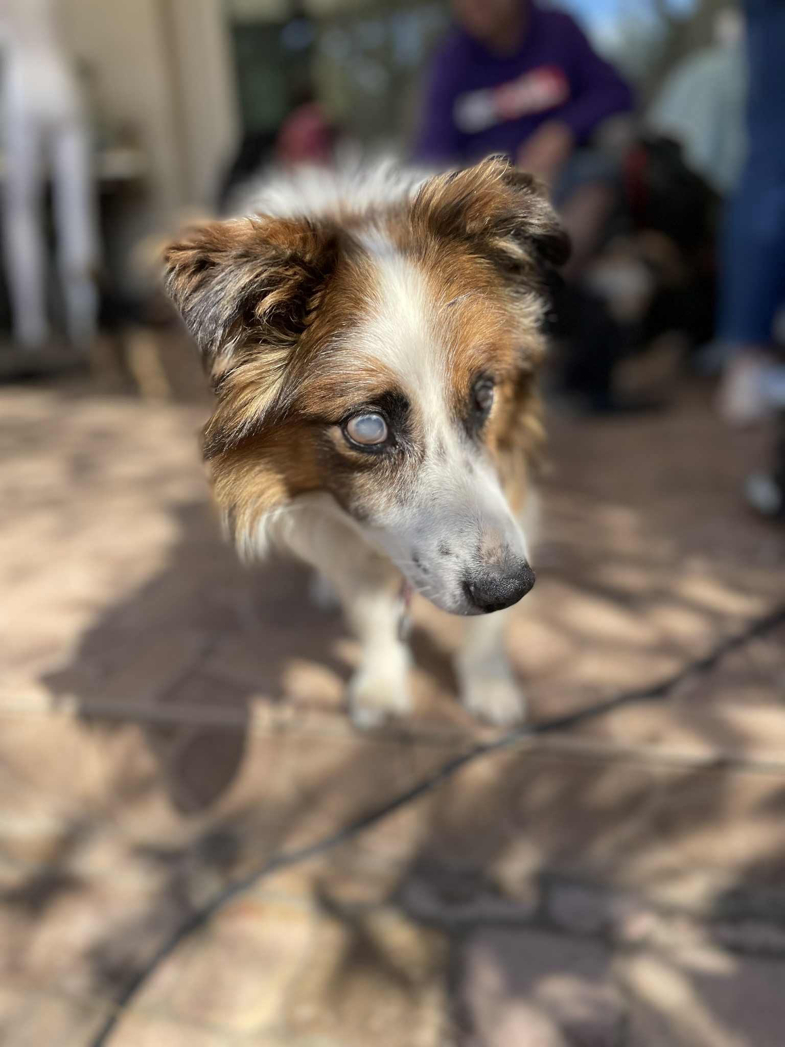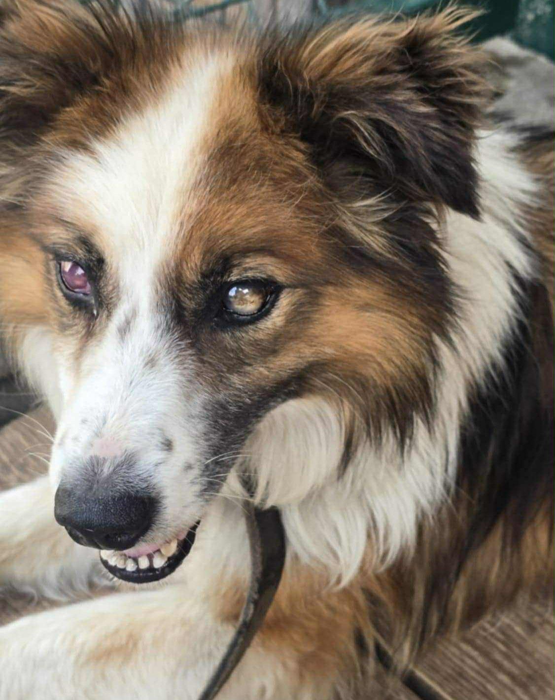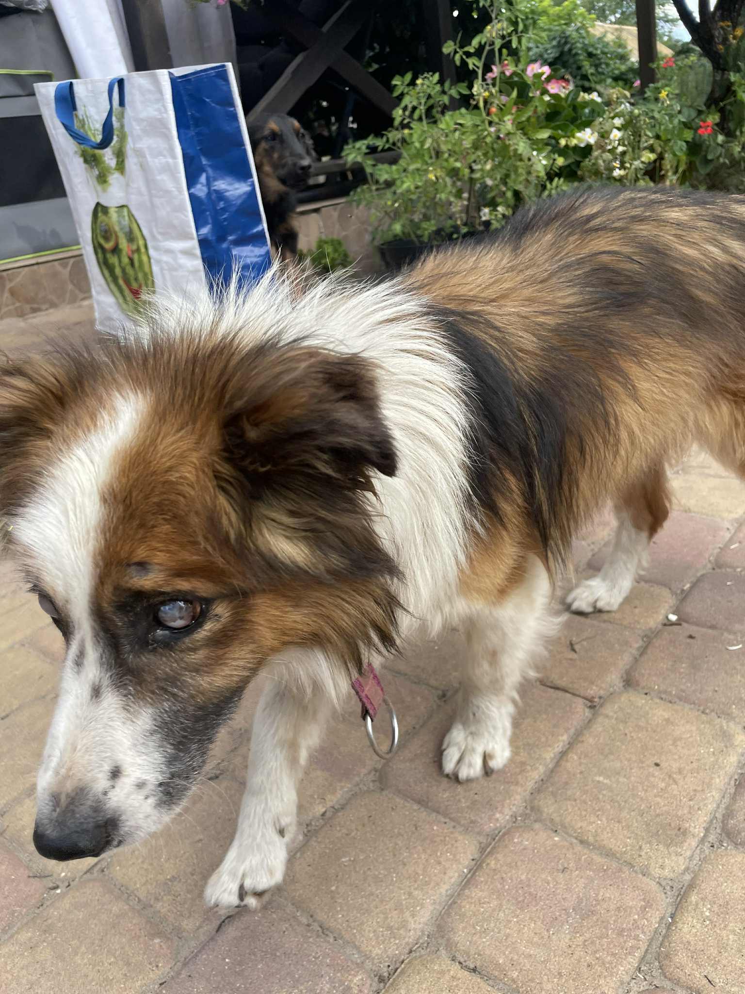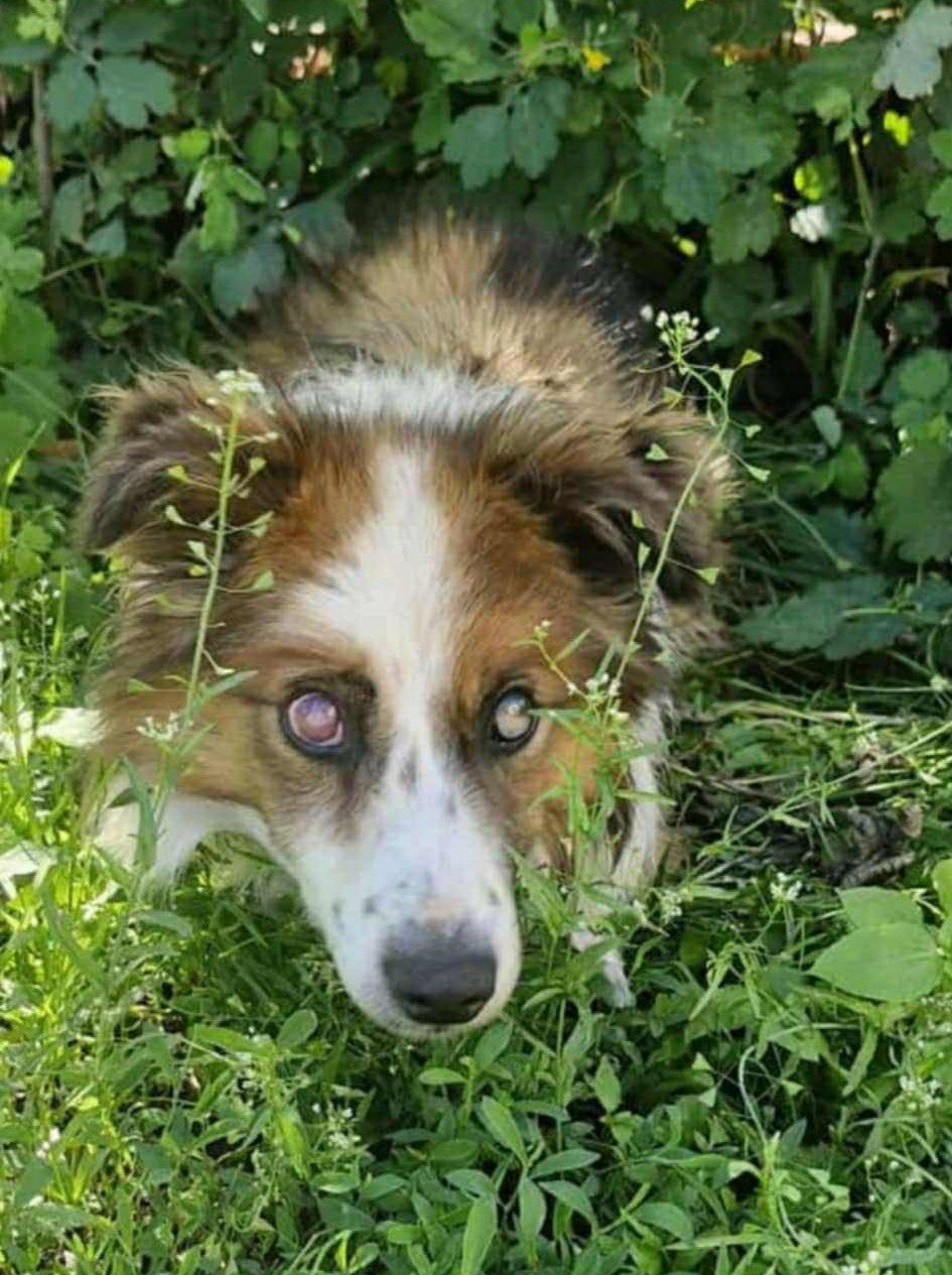 Trafił do nas z gminnej przechowalni już jako pies całkowicie niewidomy. W jednym oku doszło do zaniku gałki ocznej (phthisis bulbi), a w drugim do krwawień i poważnego uszkodzenia soczewki, które doprowadziły do lizy gałki ocznej. Lekarze potwierdzili, że wzroku nie da się już przywrócić. Collie jednak się nie poddał – nauczył się korzystać z innych zmysłów i radzi sobie w codziennym życiu naprawdę dobrze. Jego świat to zapachy, dźwięki, dotyk.