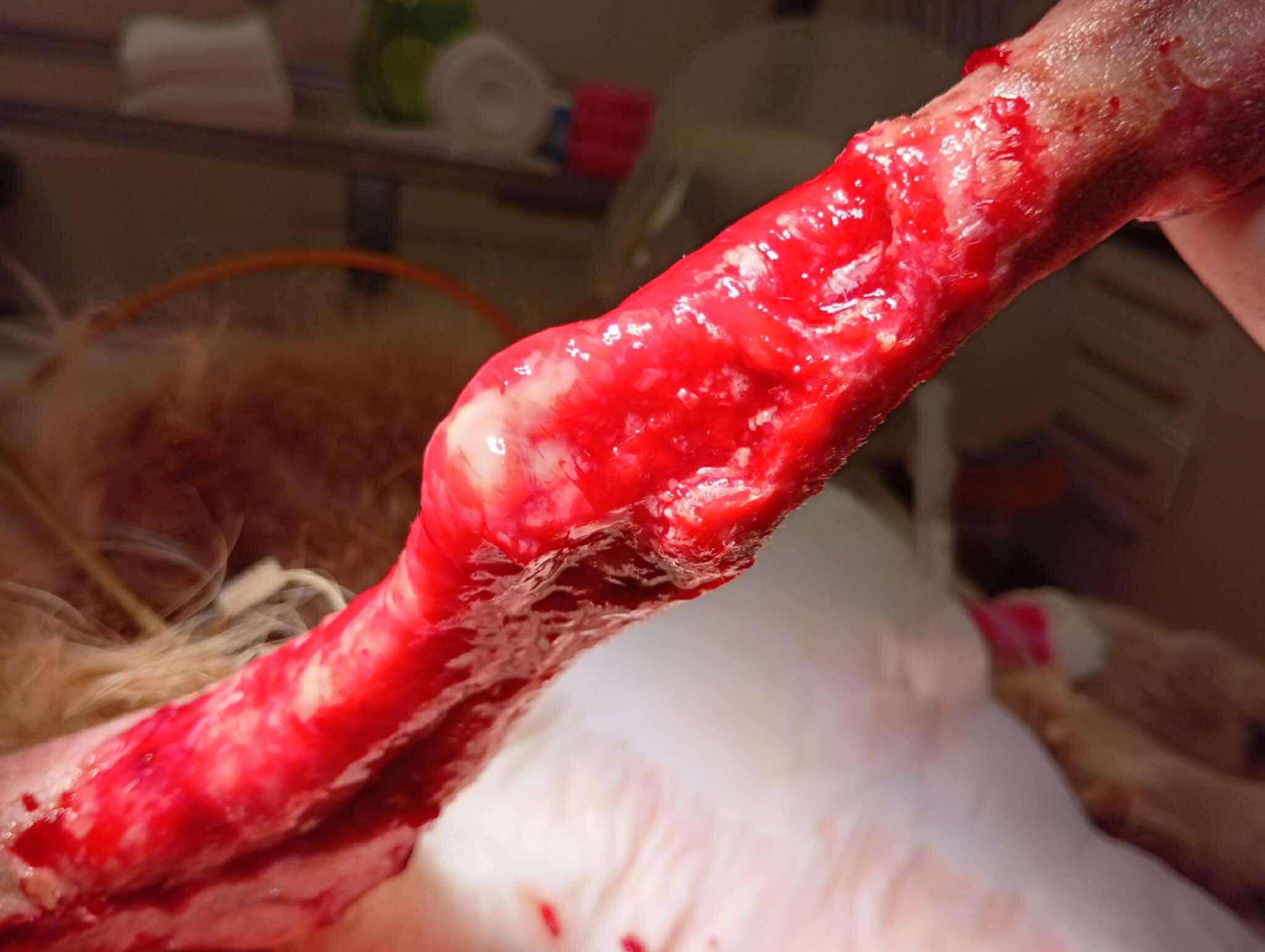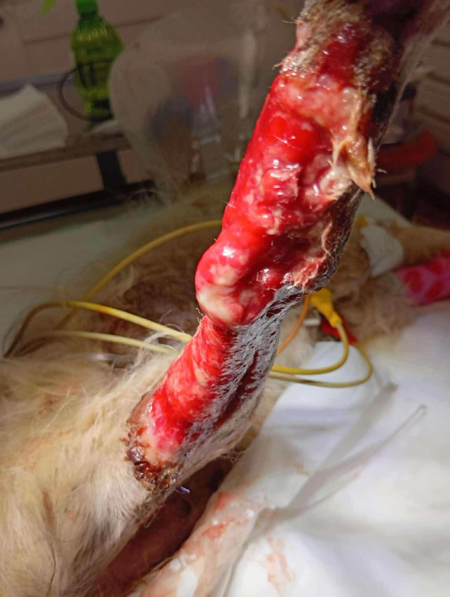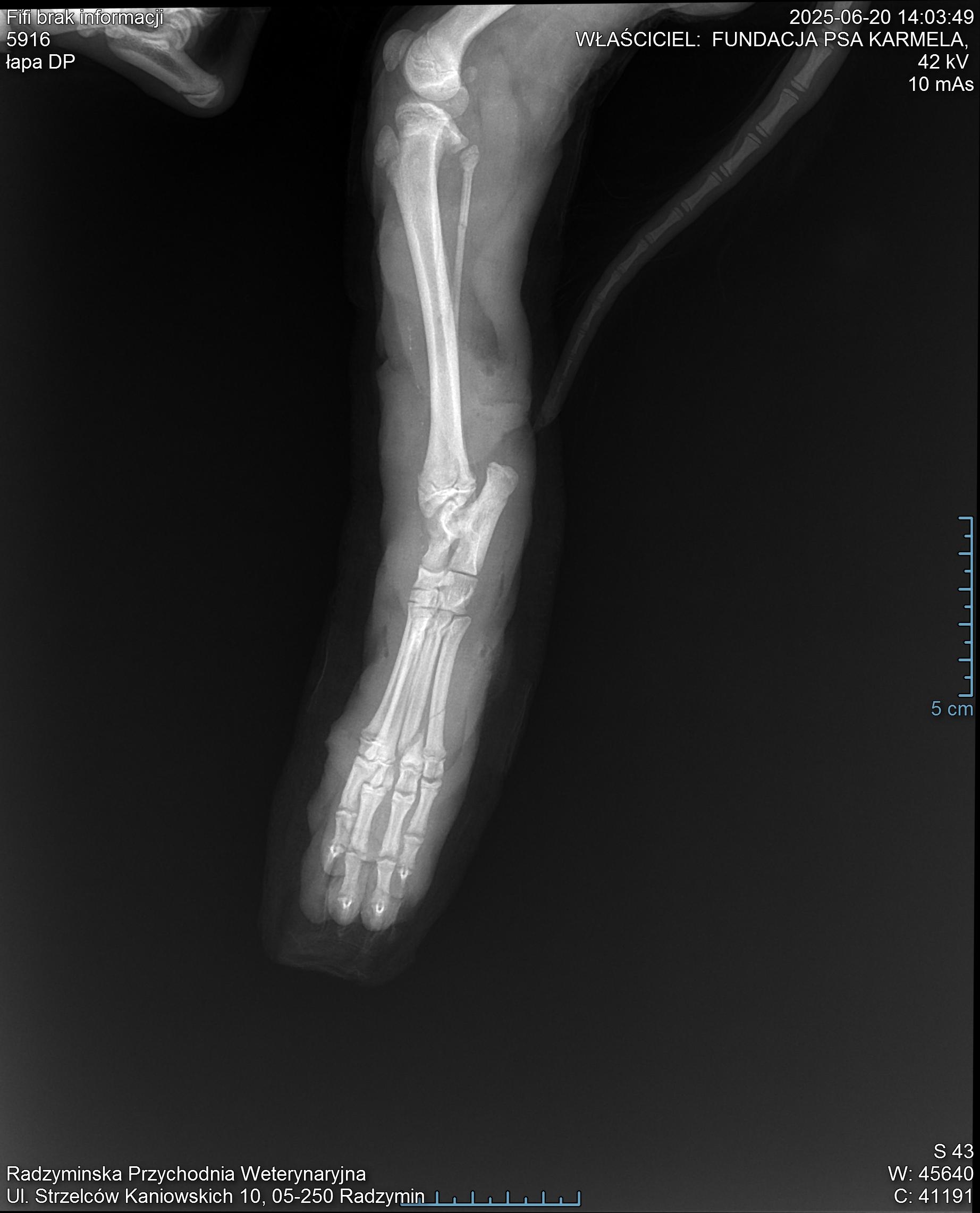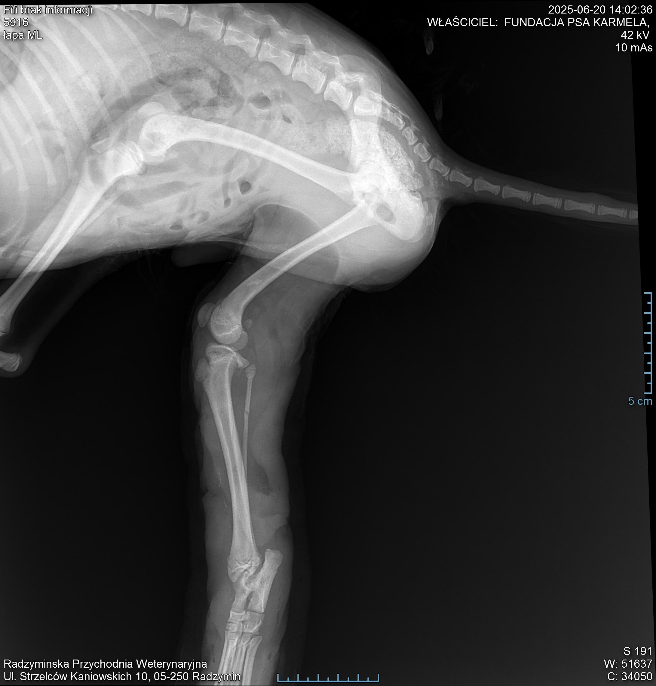 Rana goi się bardzo powoli. Regularnie zakładany jest nowy opatrunek, stosowana jest silna terapia przeciwbólowa i antybiotykowa. Do tego złamania. Lekarze ostrzegają, że proces będzie długi, możliwa jest martwica (zdążyła się już pojawić zanim trafił do nas), konieczna będzie także konsultacja ortopedyczna pod kątem więzadeł w kolanie. Rokowania co do łapki… bardzo ostrożne. I na pewno długie leczenie, jeśli chcemy uniknąć amputacji kończyny.