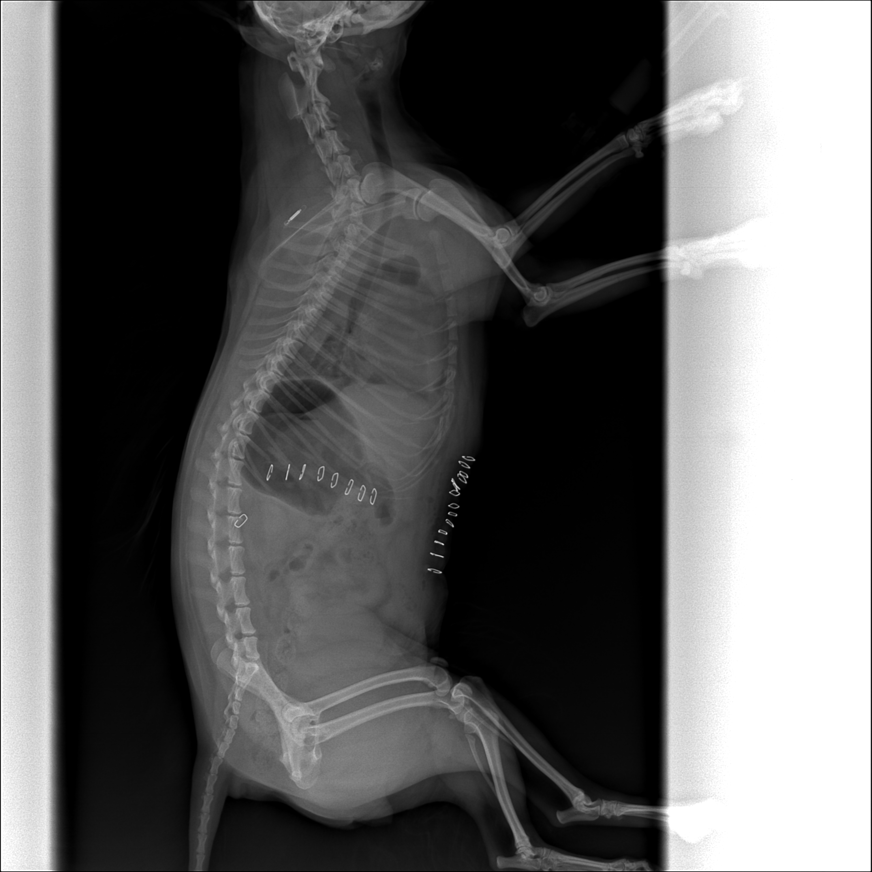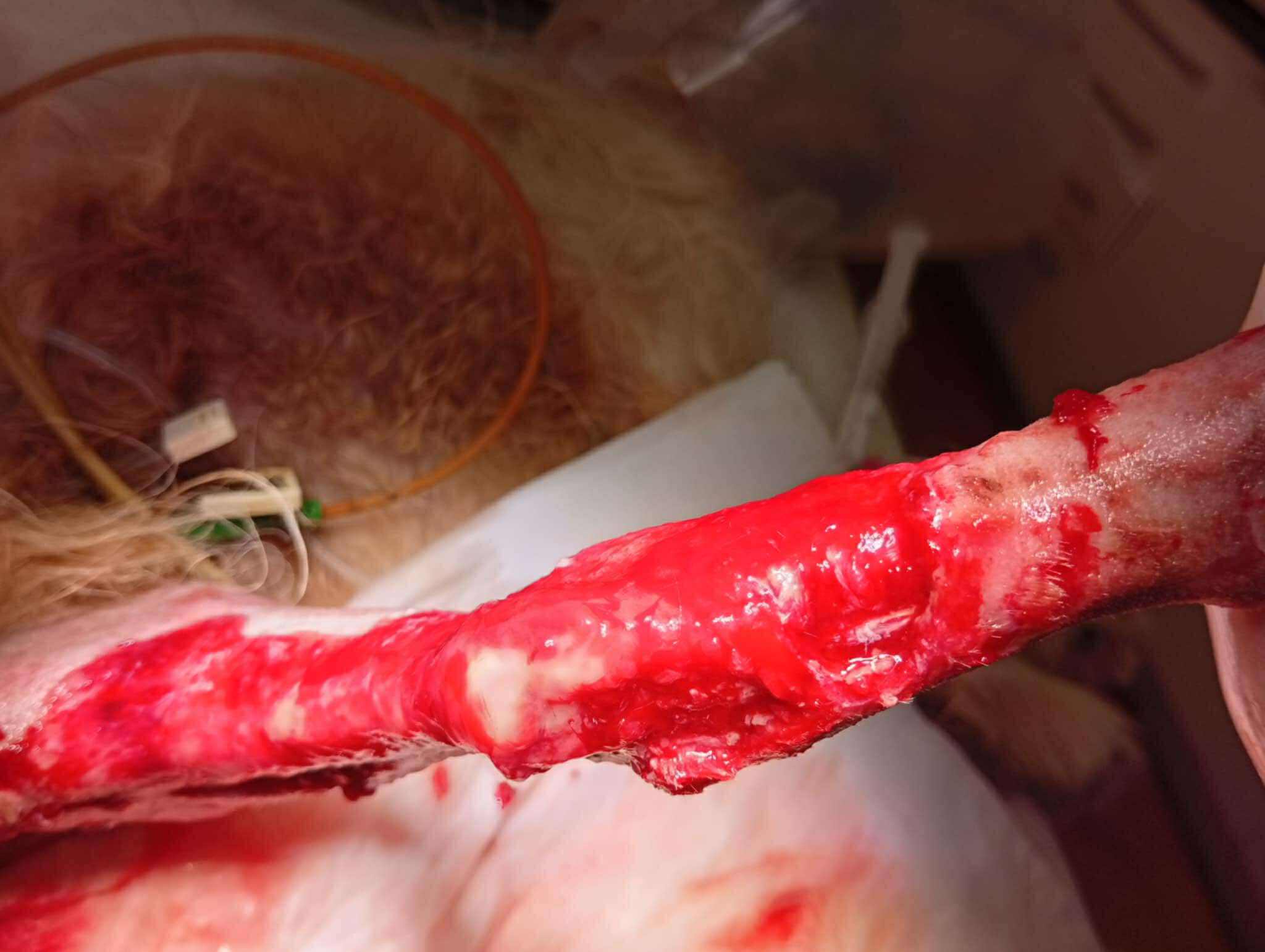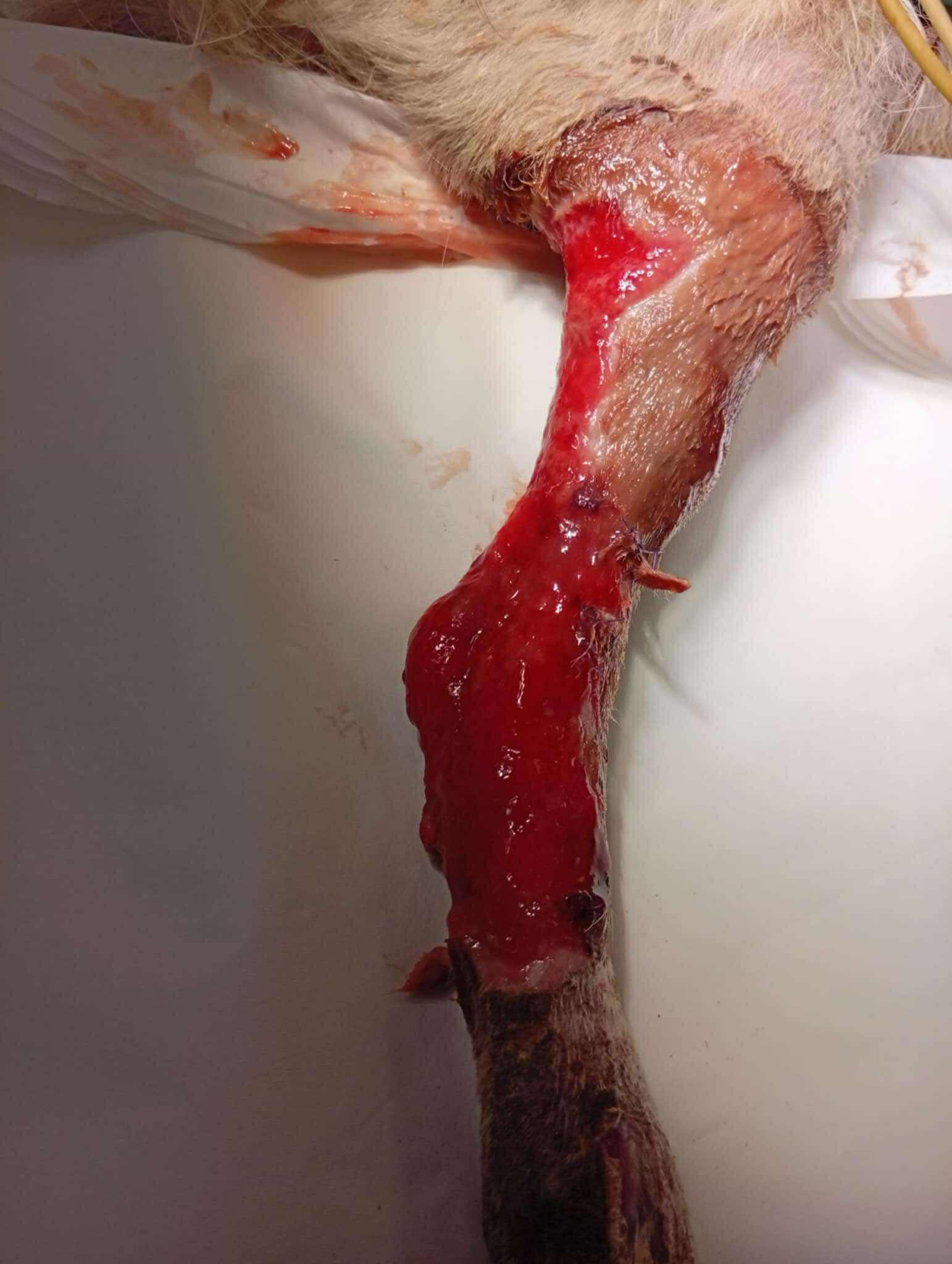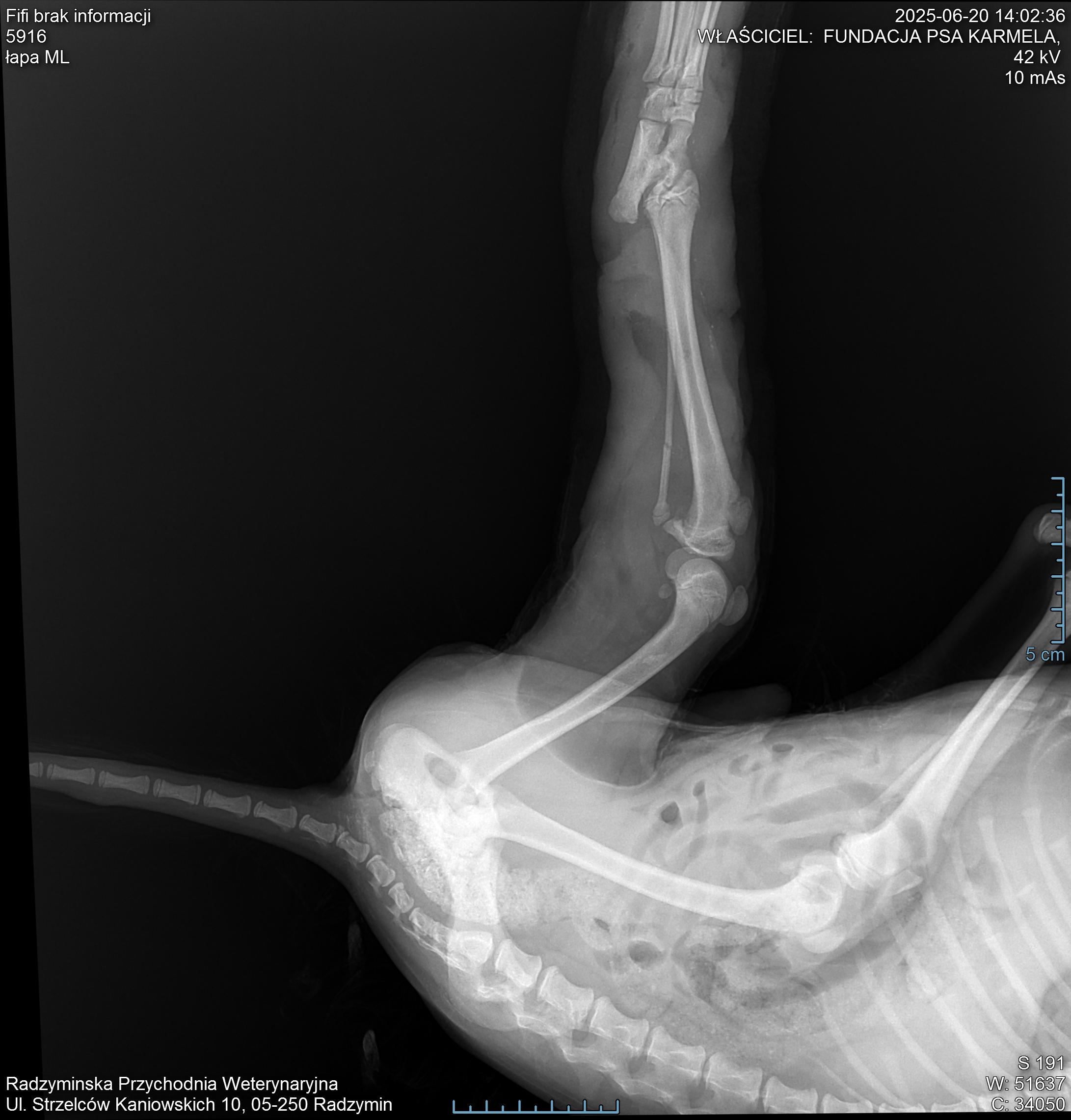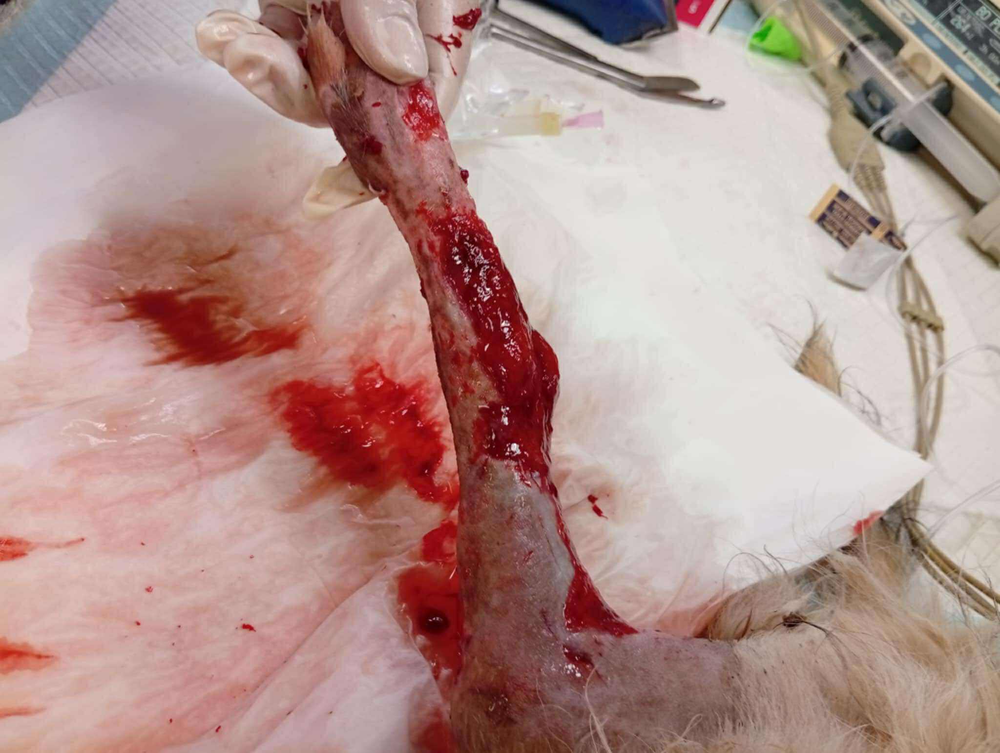 Rana goi się bardzo powoli. Regularnie zakładany jest nowy opatrunek, stosowana jest silna terapia przeciwbólowa i antybiotykowa. Do tego złamania. Lekarze ostrzegają, że proces będzie długi, możliwa jest martwica (zdążyła się już pojawić zanim trafił do nas), konieczna będzie także konsultacja ortopedyczna pod kątem więzadeł w kolanie. Rokowania co do łapki… bardzo ostrożne. I na pewno długie leczenie, jeśli chcemy uniknąć amputacji kończyny.