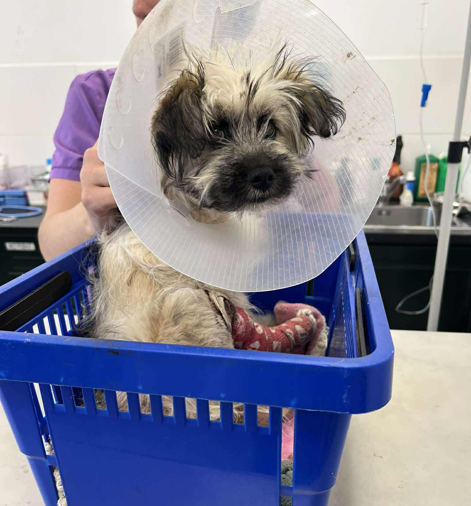Ból musiał być potworny. Fifi przyjechał wtedy z właścicielami. Po kilku dniach – wiedząc, że dalej nie podołają – zdecydowali się oddać go do naszej fundacji. Już jest z nami. Przyjechał do nas w koszyku sklepowym.
