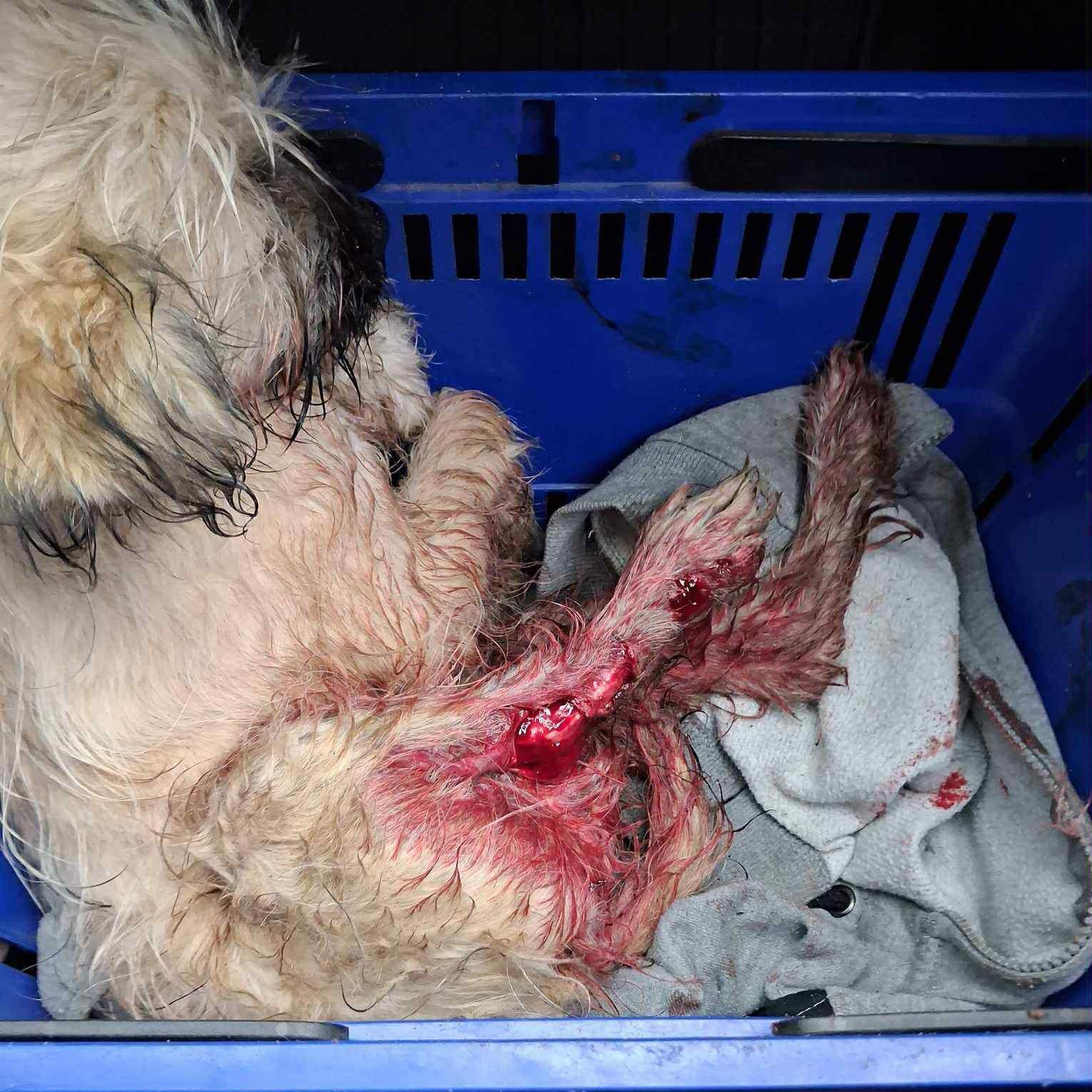Szczeniaczek Fifi z oskórowaną i złamaną łapką po wypadku