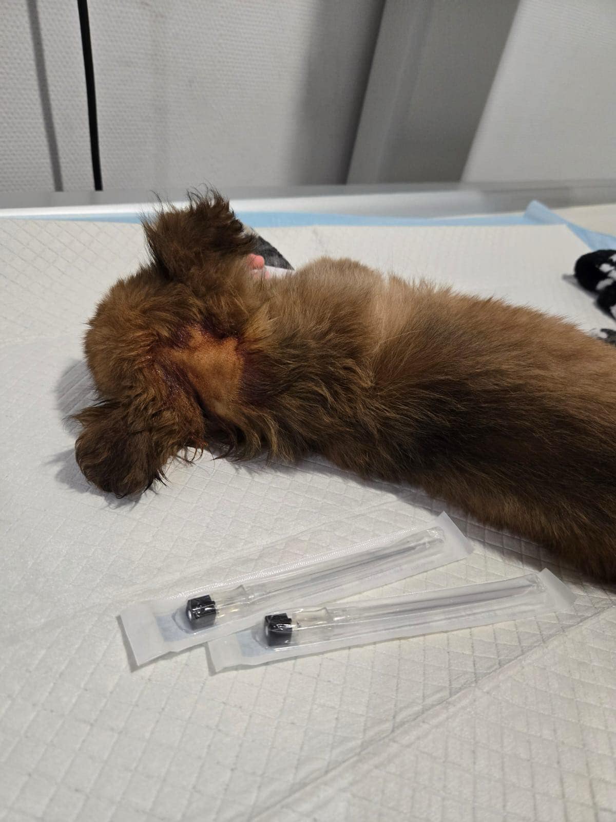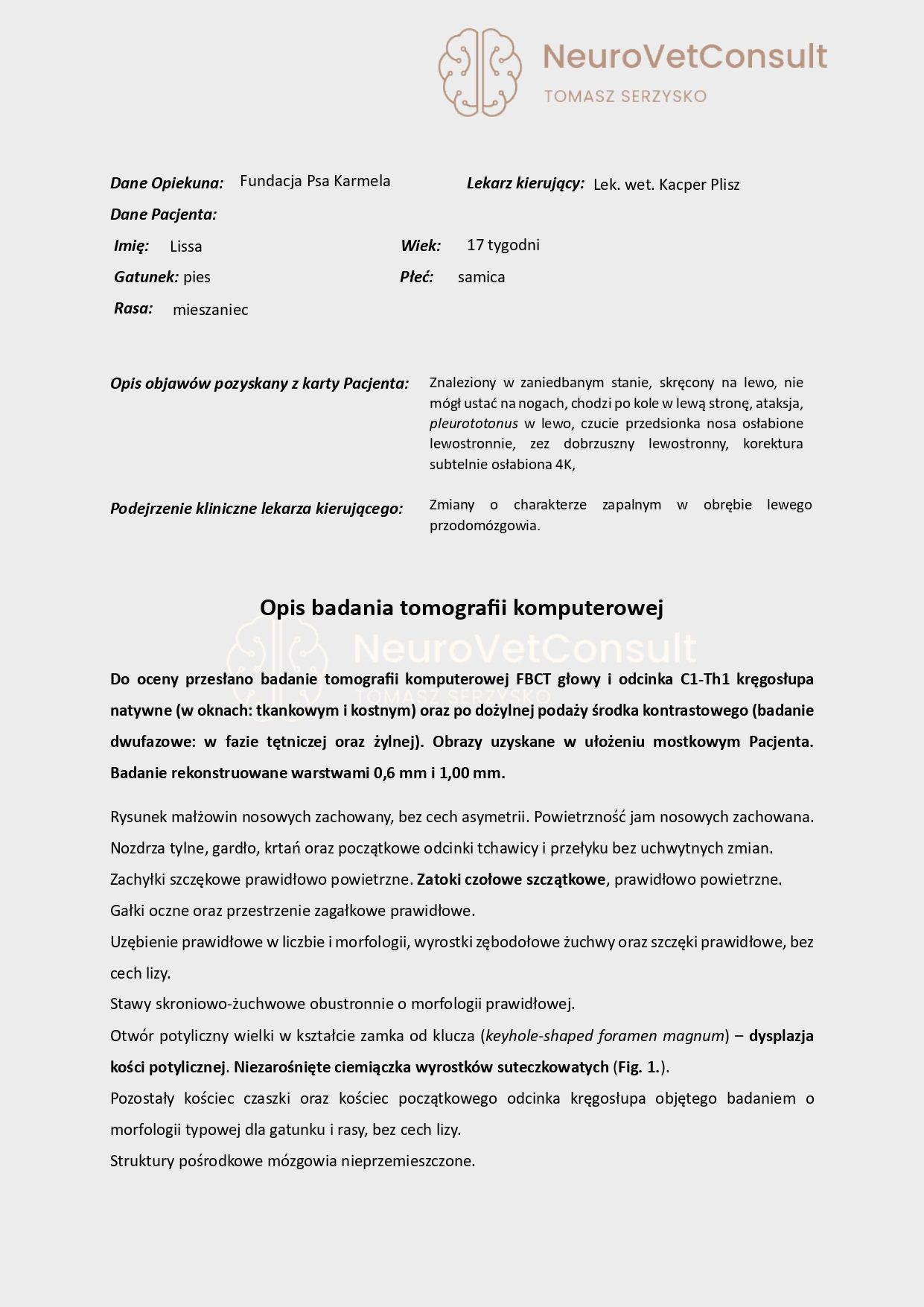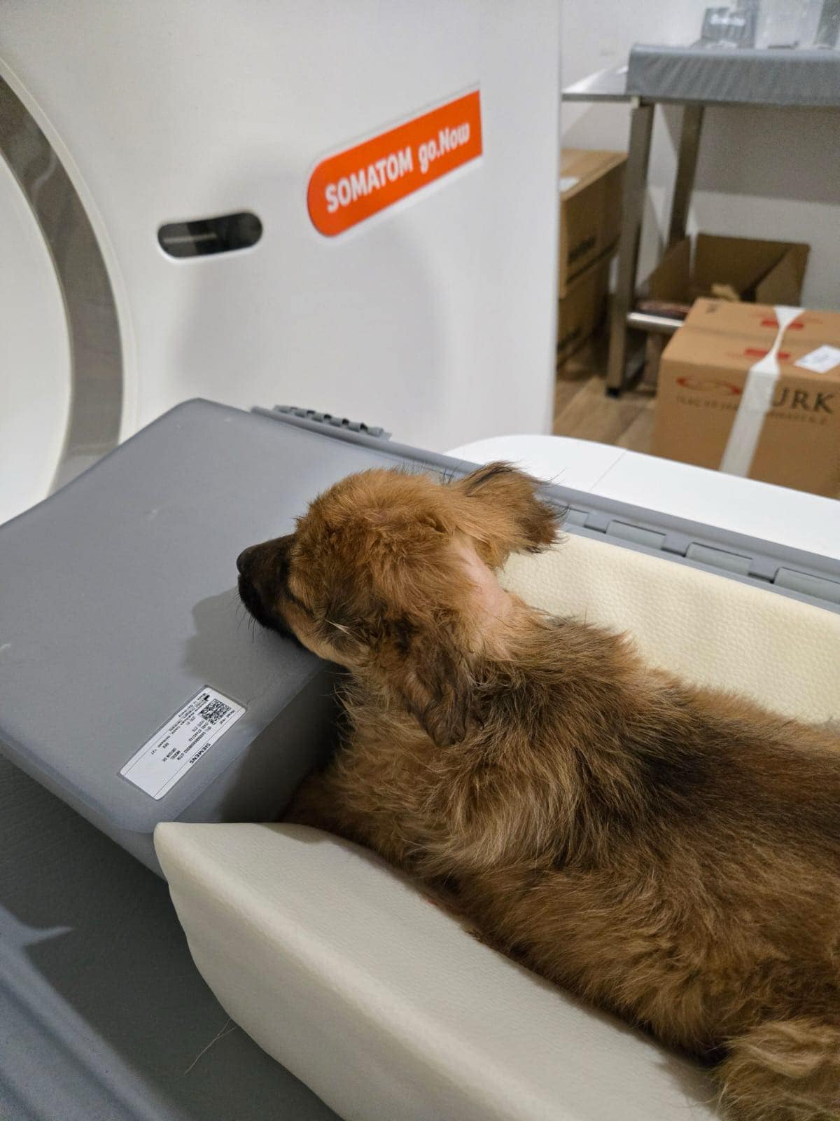 Natychmiast trafiła do całodobowej kliniki weterynaryjnej, gdzie zajęli się nią najlepsi specjaliści. Badanie neurologiczne wykazało silne zaburzenia – ataksję, pleurotonus (skręcenie ciała w lewą stronę), zez i osłabione czucie w części głowy. Podejrzenie? Pęknięcie czaszki z odłamkami naciskającymi lub wbitymi w mózg, zapalenie opon mózgowo-rdzeniowych – stan bardzo poważny, mogący prowadzić do trwałych uszkodzeń układu nerwowego albo nawet śmierci. Wobec tego niezbędna okazała się tomografia komputerowa głowy z kontrastem i pobranie płynu mózgowo-rdzeniowego.