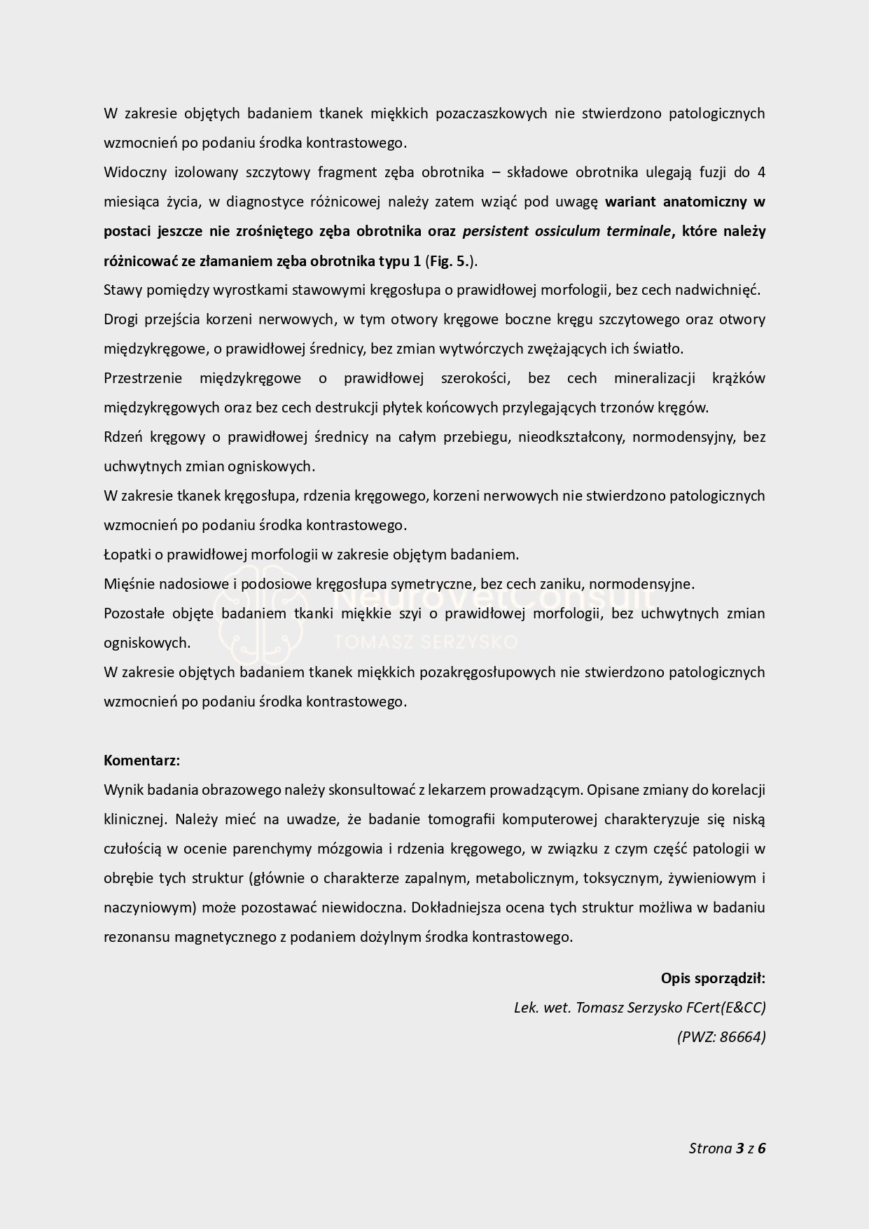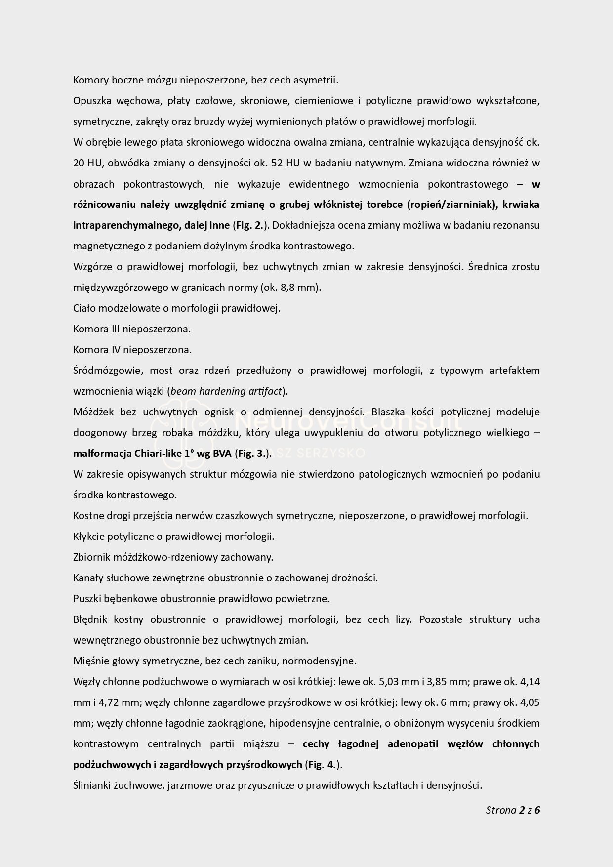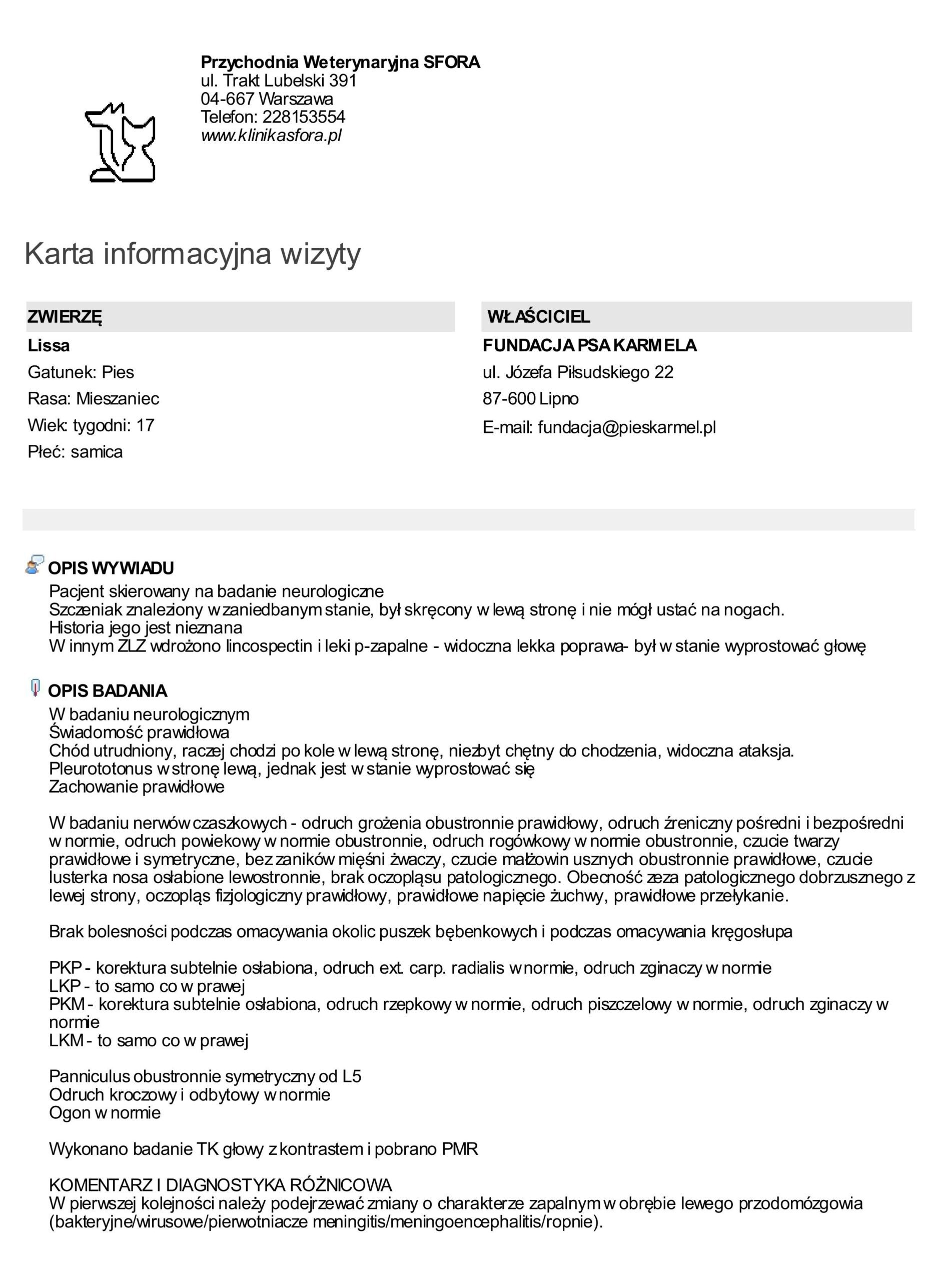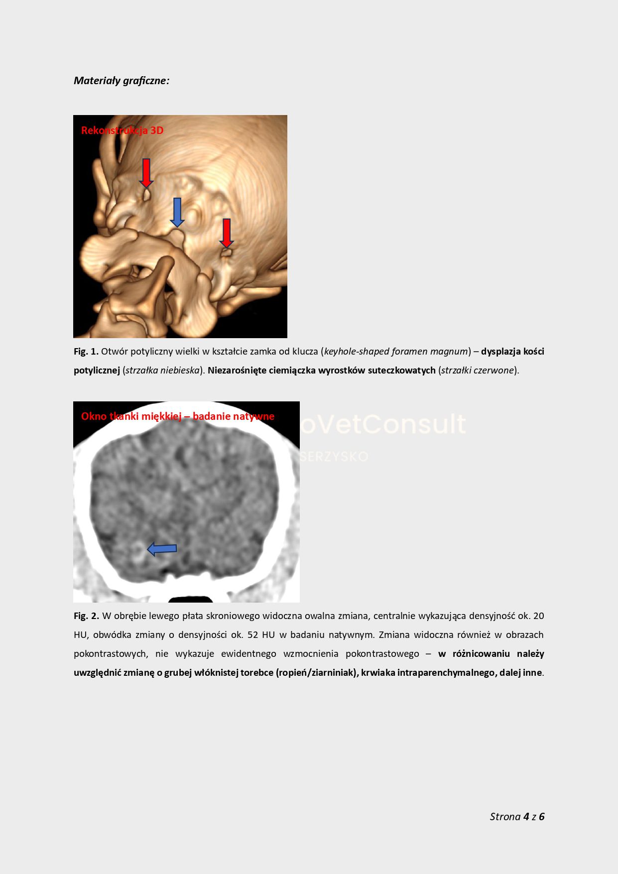 Natychmiast trafiła do całodobowej kliniki weterynaryjnej, gdzie zajęli się nią najlepsi specjaliści. Badanie neurologiczne wykazało silne zaburzenia – ataksję, pleurotonus (skręcenie ciała w lewą stronę), zez i osłabione czucie w części głowy. Podejrzenie? Pęknięcie czaszki z odłamkami naciskającymi lub wbitymi w mózg, zapalenie opon mózgowo-rdzeniowych – stan bardzo poważny, mogący prowadzić do trwałych uszkodzeń układu nerwowego albo nawet śmierci. Wobec tego niezbędna okazała się tomografia komputerowa głowy z kontrastem i pobranie płynu mózgowo-rdzeniowego.