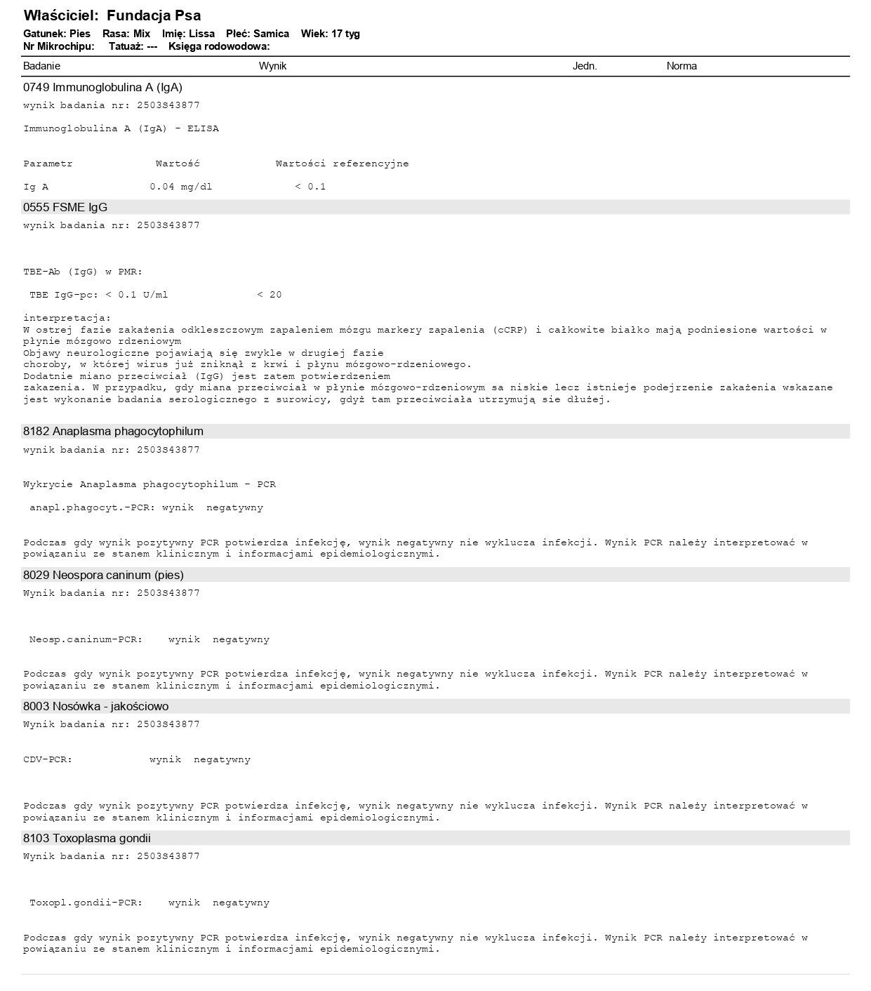 Lissa wymaga specjalistycznej, długotrwałej terapii neurologicznej, dalszej diagnostyki oraz intensywnej antybiotykoterapii i leków przeciwzapalnych. Dodatkowo potrzebuje rehabilitacji, suplementacji i kontroli weterynaryjnych.