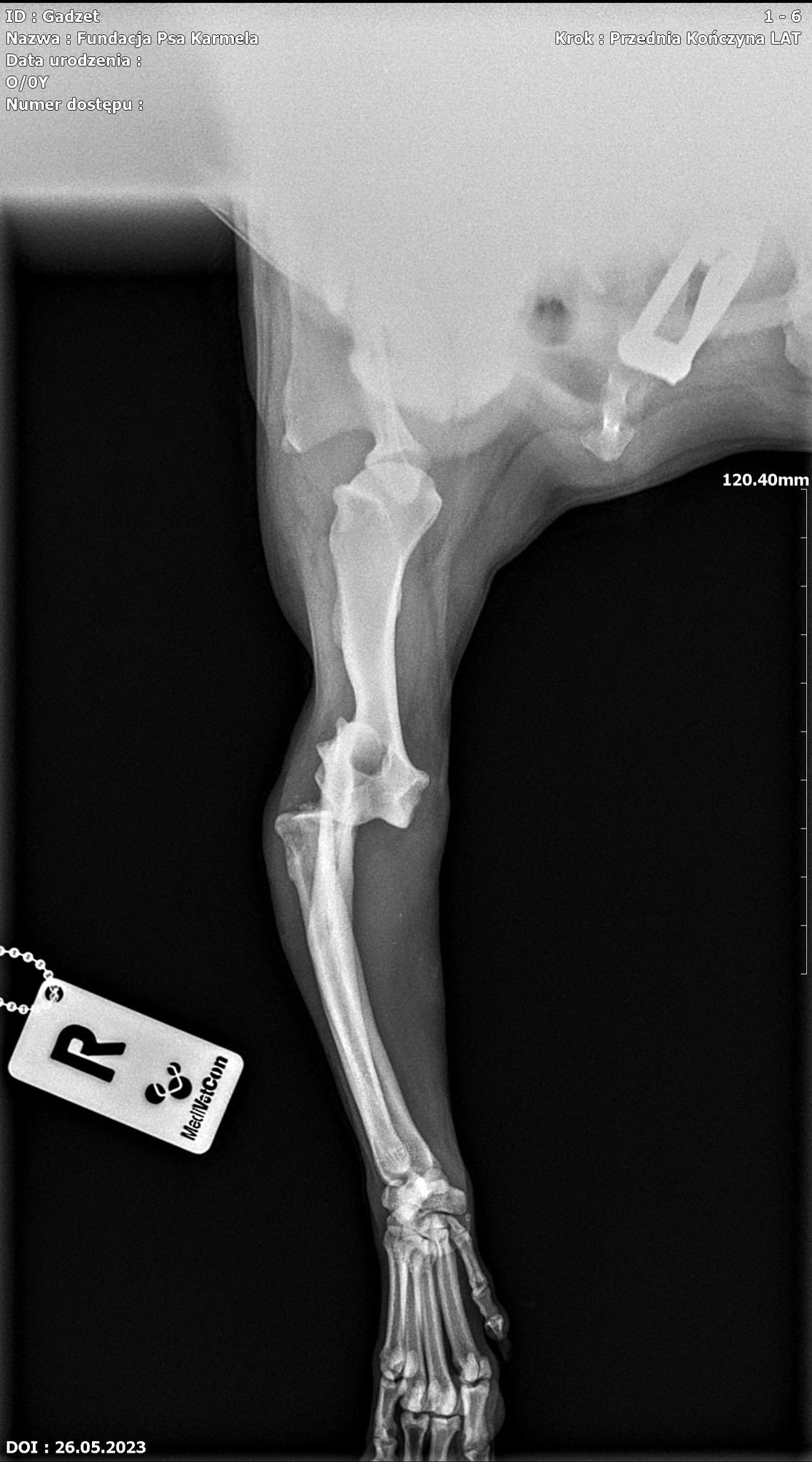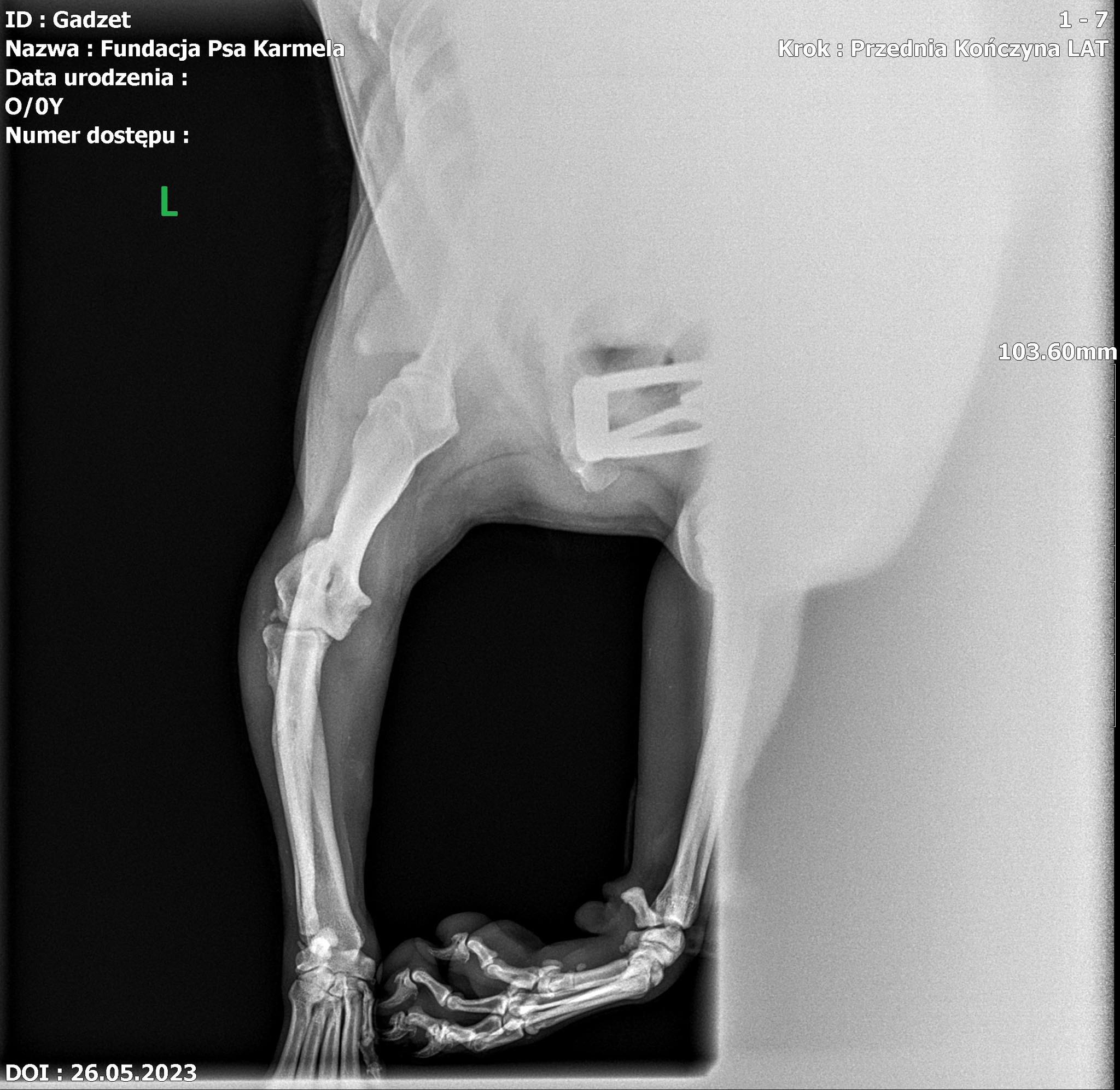 Trzykrotnie próbowano nastawić łapę Gadżeta… bez powodzenia. Groziła mu amputacja. Ostatecznie znalazł się chirurg, który podejmie się operacji złożenia łapki… czekamy.
