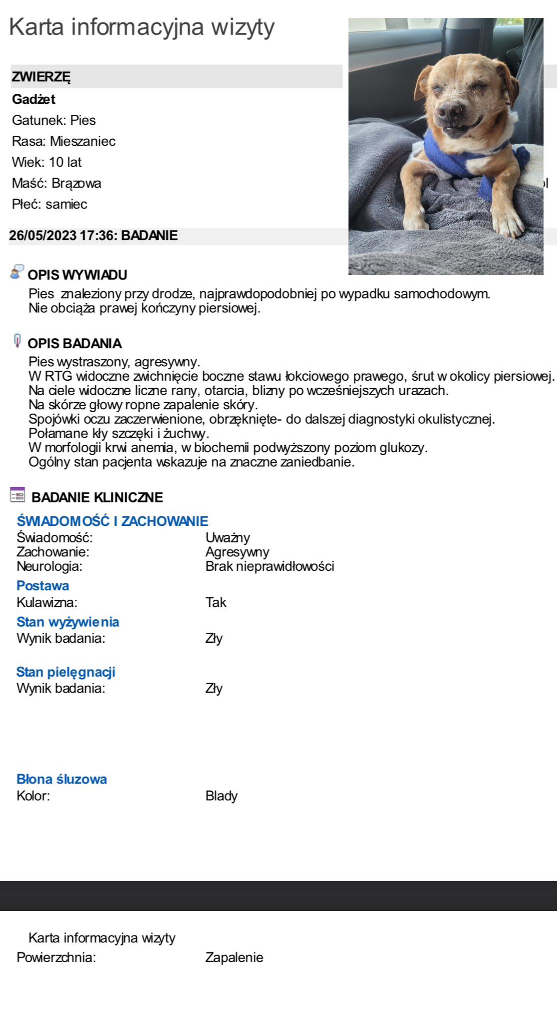Oprócz jego łapki i rozwalonych oczu znaleziono m.in. śrut w okolicy piersiowej, a na ciele widoczne liczne rany, otarcia, blizny po wcześniejszych urazach. Na skórze głowy ropne zapalenie skóry. Spojówki oczu zaczerwienione, obrzęknięte, połamane kły szczęki i żuchwy. W morfologii krwi anemia, w biochemii podwyższony poziom glukozy. Znacznego stopnia niedomykalność zastawek. Ogólny stan pacjenta wskazuje na znaczne zaniedbanie. Stan wyżywienia i stan pielęgnacji – złe.