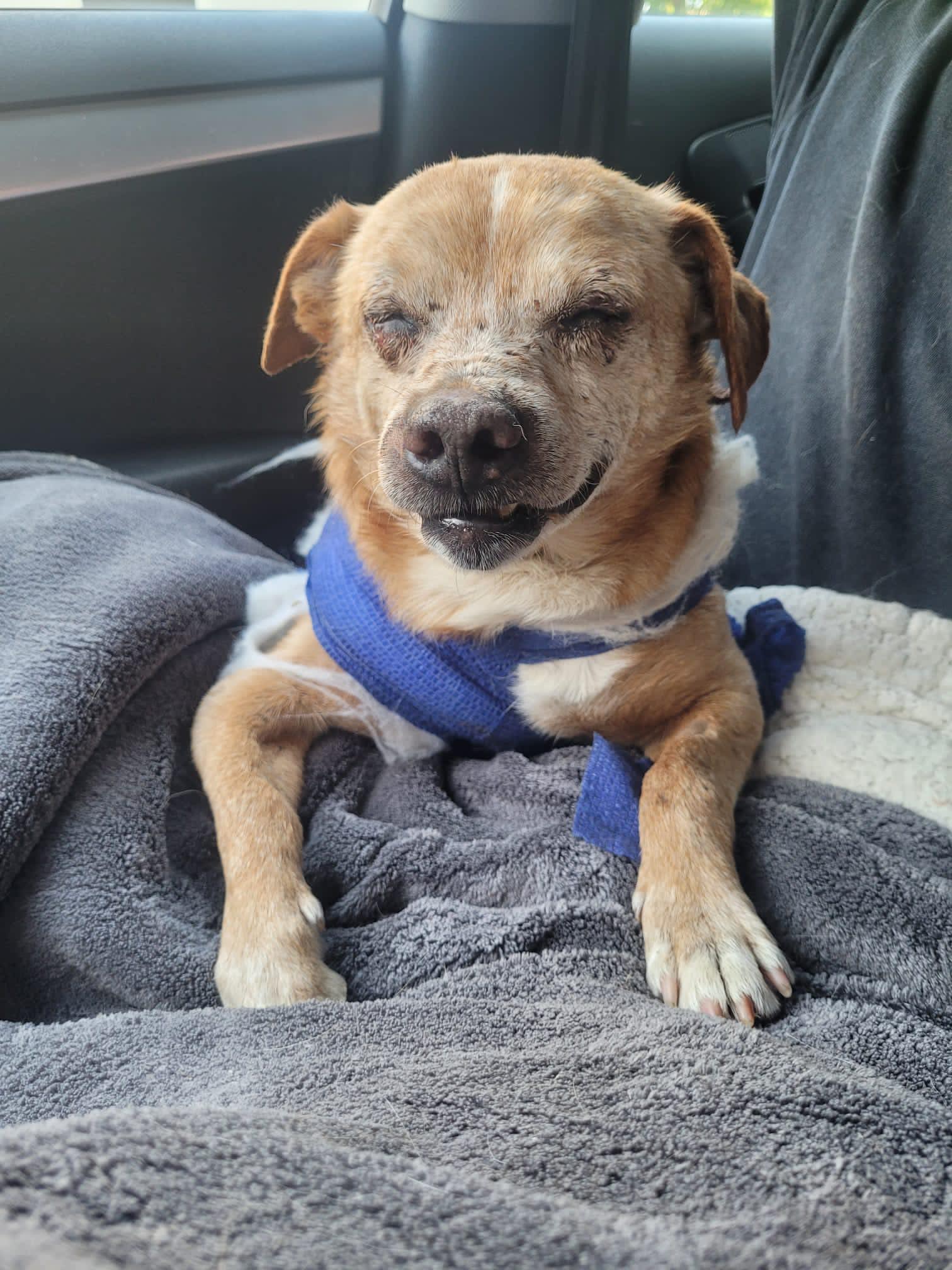 Kilkadziesiąt metrów dalej dostrzegliśmy innego małego psiaka… był po wypadku samochodowym, ledwie poruszał się, łapkę trzymał w powietrzu, wył z bólu. Mimo naszej sytuacji nie mogliśmy go zostawić. A podobno „chodził” tak od tygodnia, nikt nie zareagował tak jak trzeba, łącznie z właścicielami. I to nie pierwsza, i nie druga tragedia jaka spotkała tego psiaka… jak powiedział nam właściciel – on miał już wiele wypadków. Widać po nim ile przeszedł.