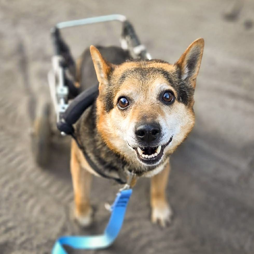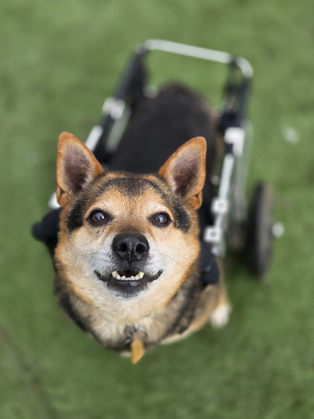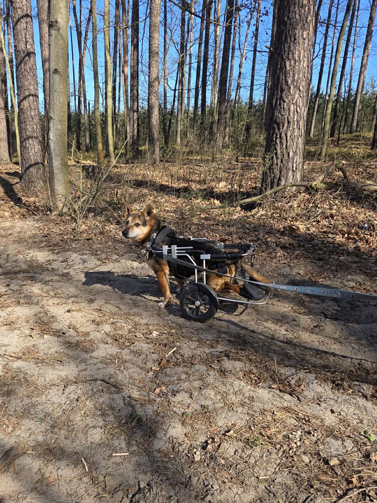 To piesek z całkowitym porażeniem tylnych łap, dlatego jeździ na wózku. Ale to dla niego żaden problem, by żyć z wielką radością i roześmianym pyszczkiem 🙂