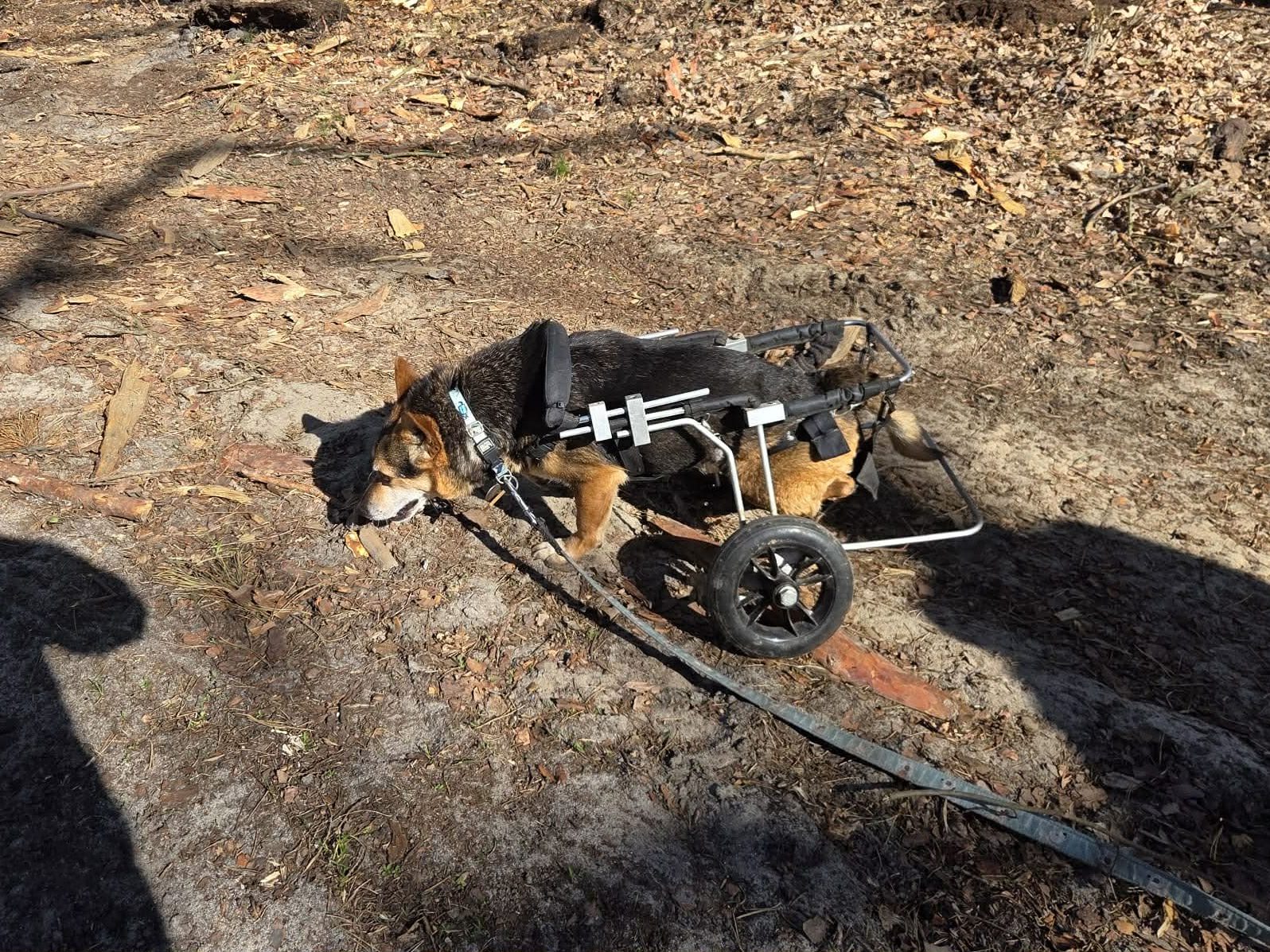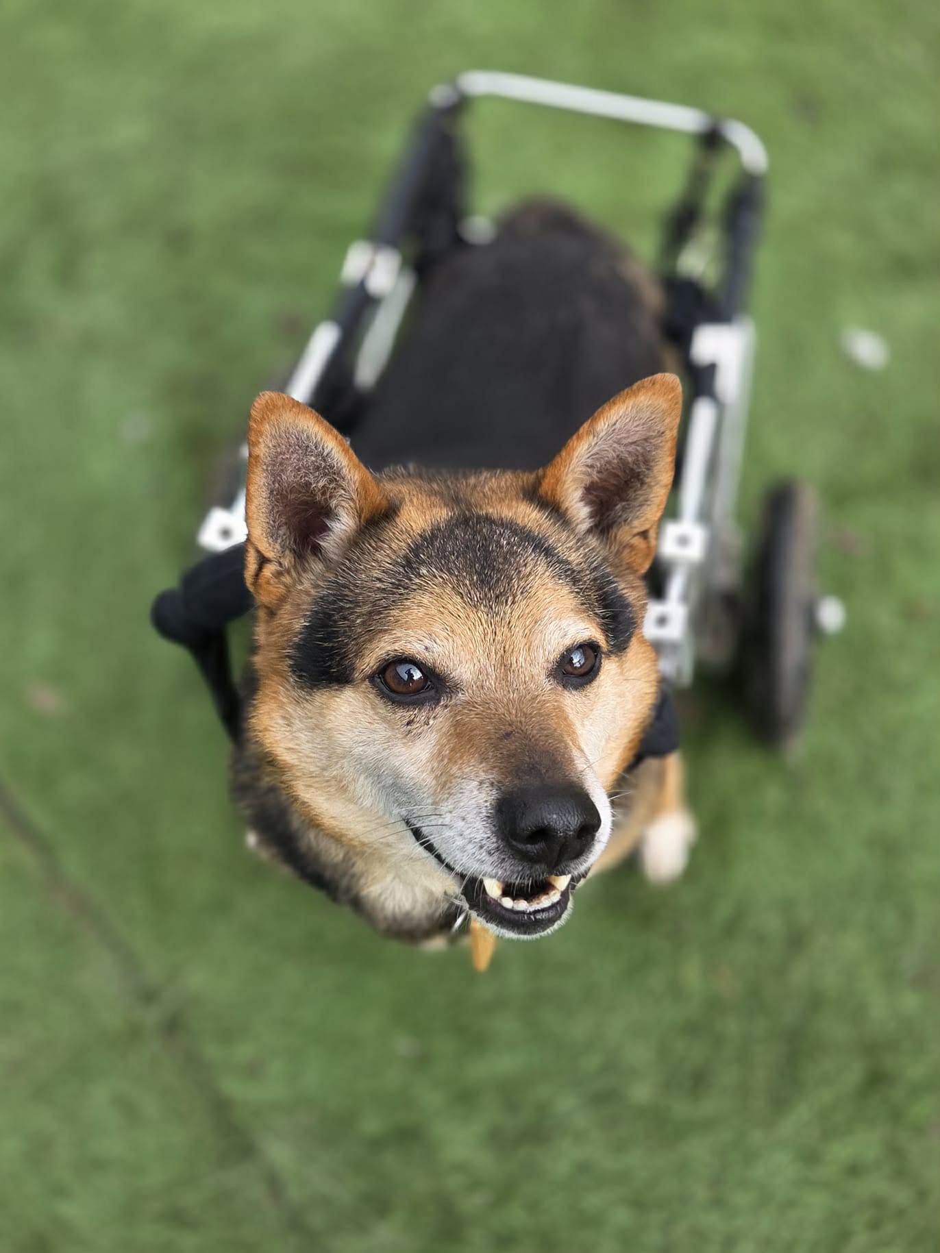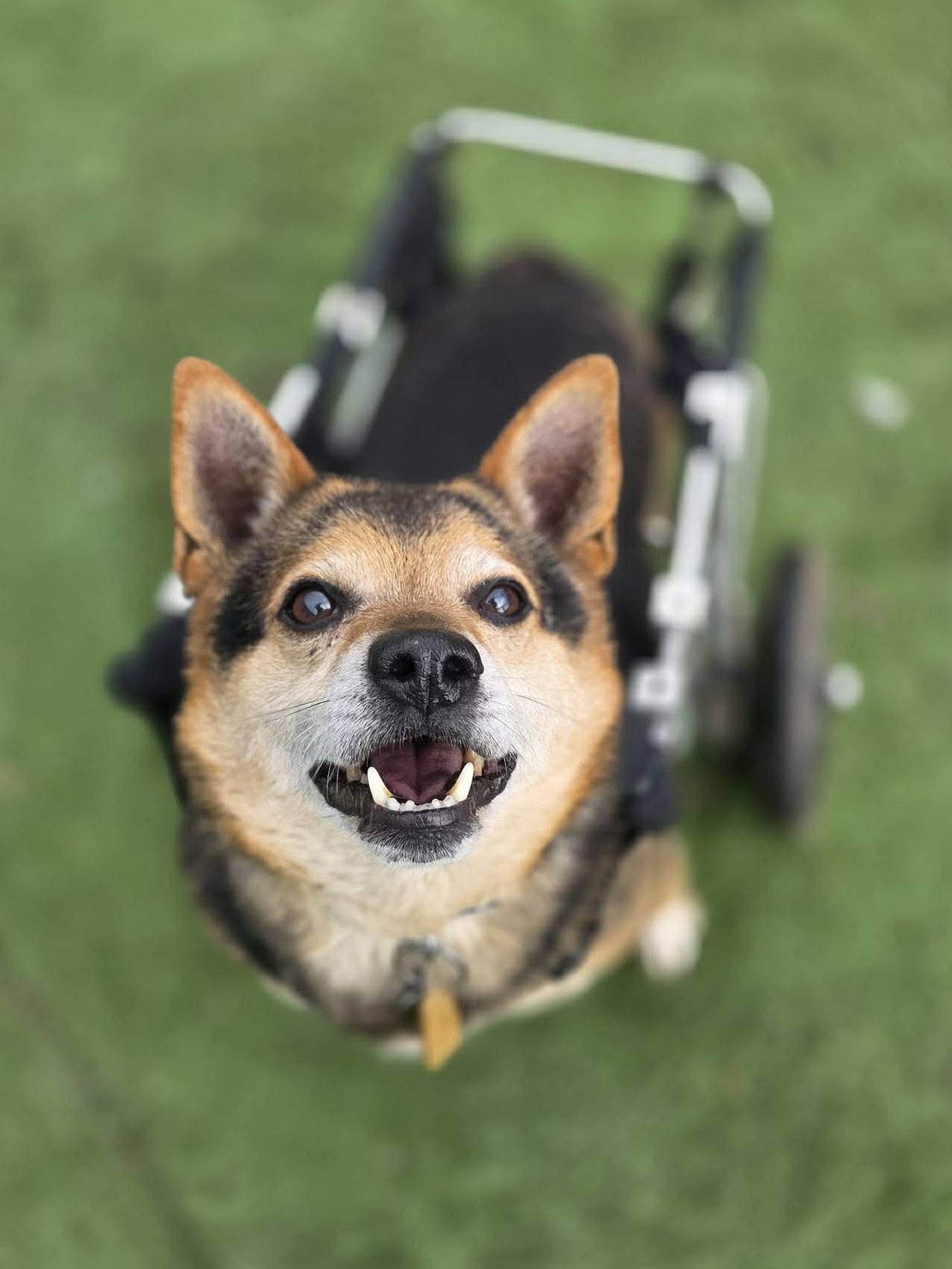 To piesek z całkowitym porażeniem tylnych łap, dlatego jeździ na wózku. Ale to dla niego żaden problem, by żyć z wielką radością i roześmianym pyszczkiem 🙂