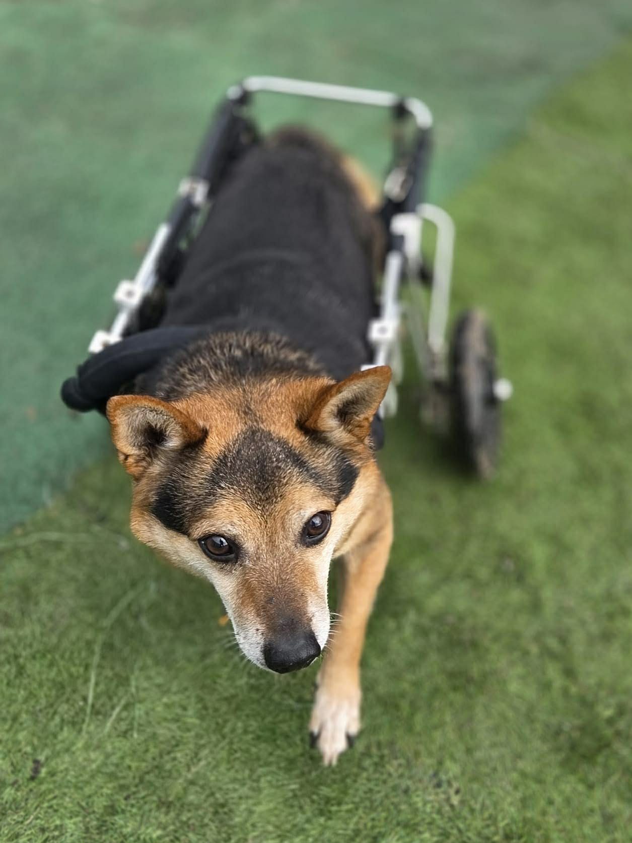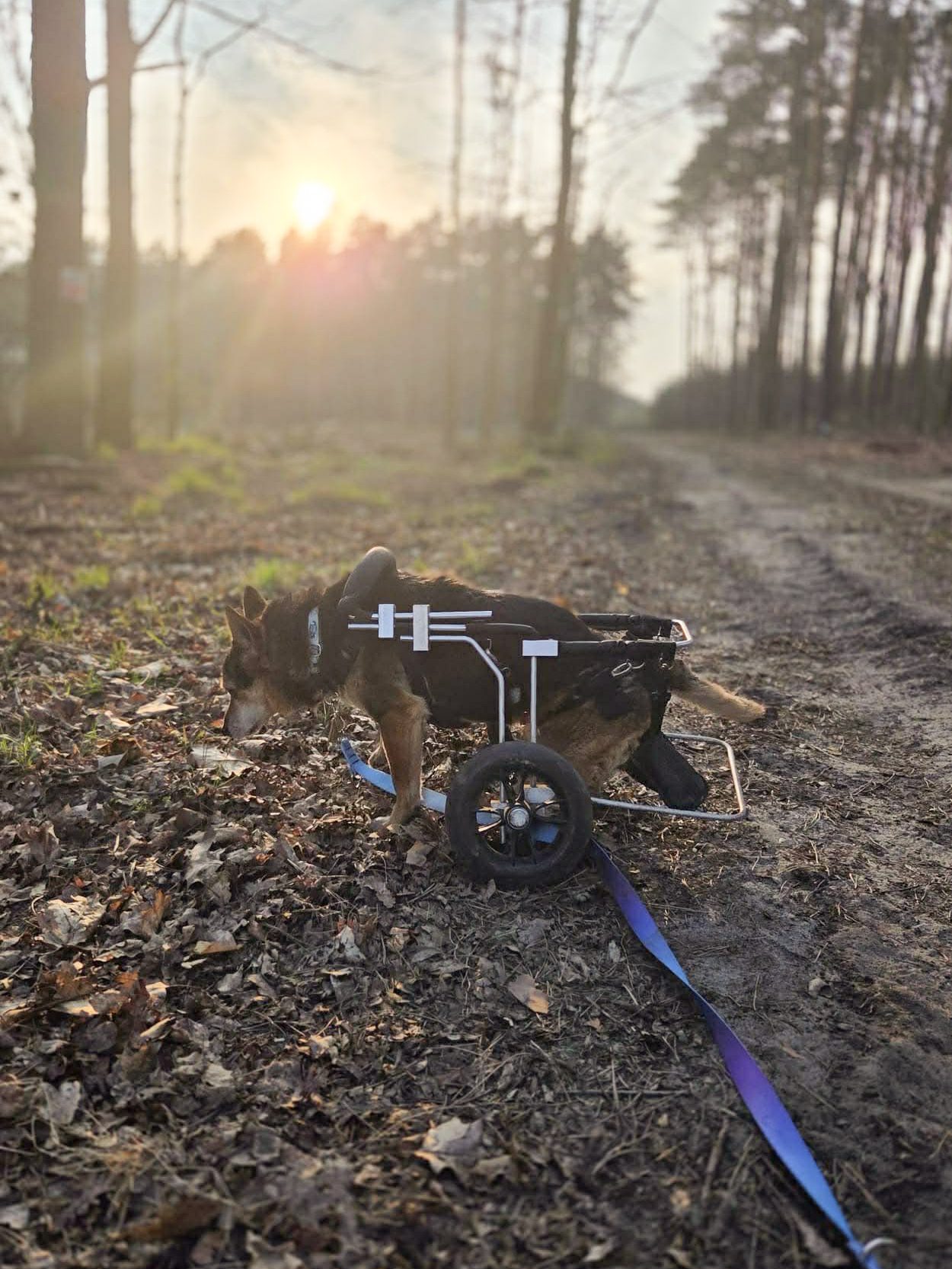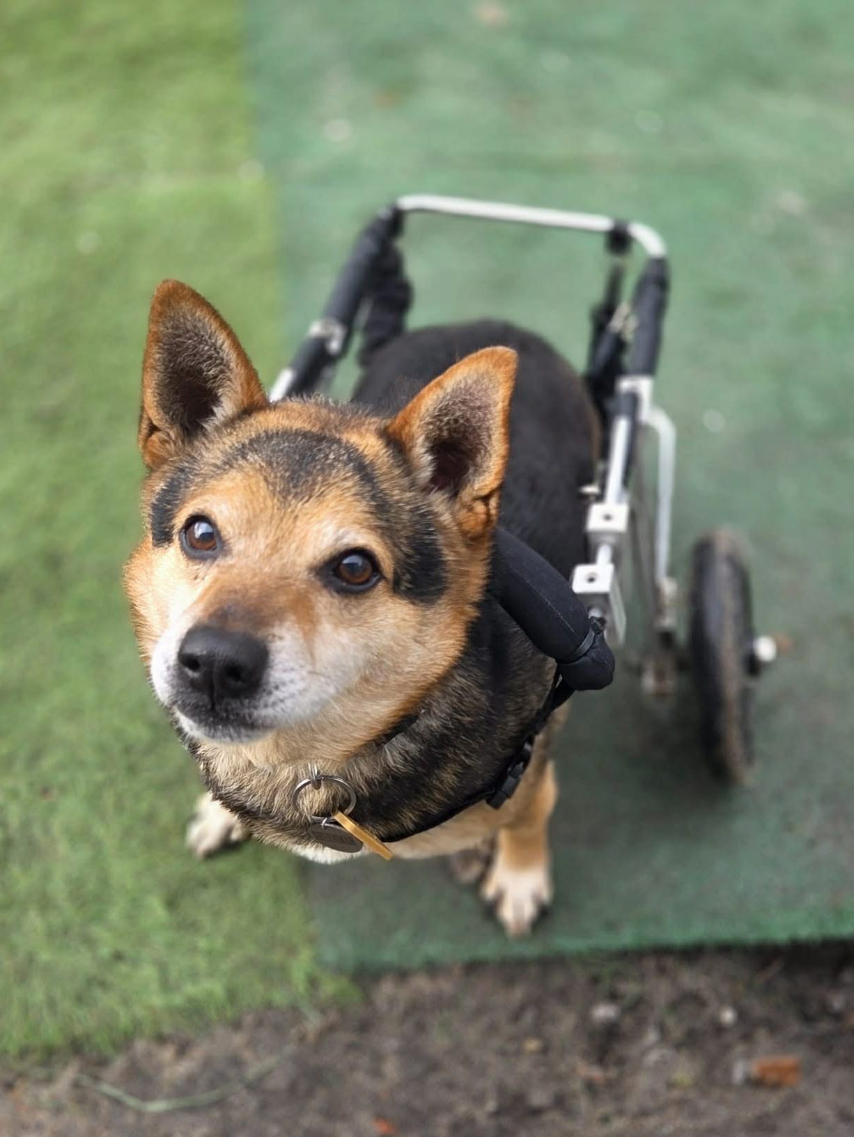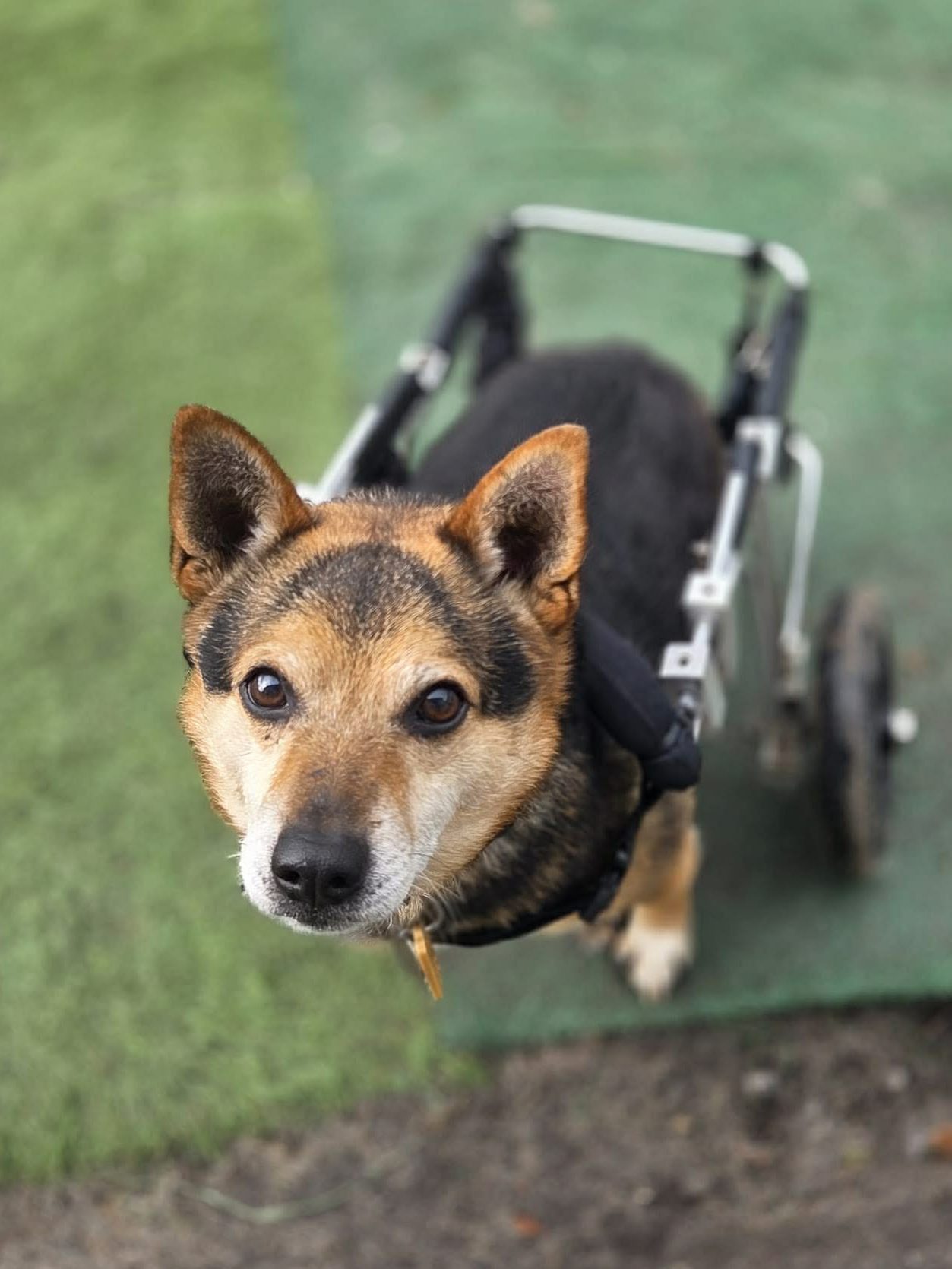 Krzysiu (zwany także Shermanem) przyjechał do nas z azylu w Kuflewie. Waży poniżej 10 kg, ma około 9 lat i… ogromne serce do życia! Choć jego tylne łapki nie działają, on kompletnie się tym nie przejmuje – śmiga na wózku jak prawdziwy mistrz Formuły 1. Spacer z nim to czysta radość (i niezły trening, żeby dotrzymać mu tempa).