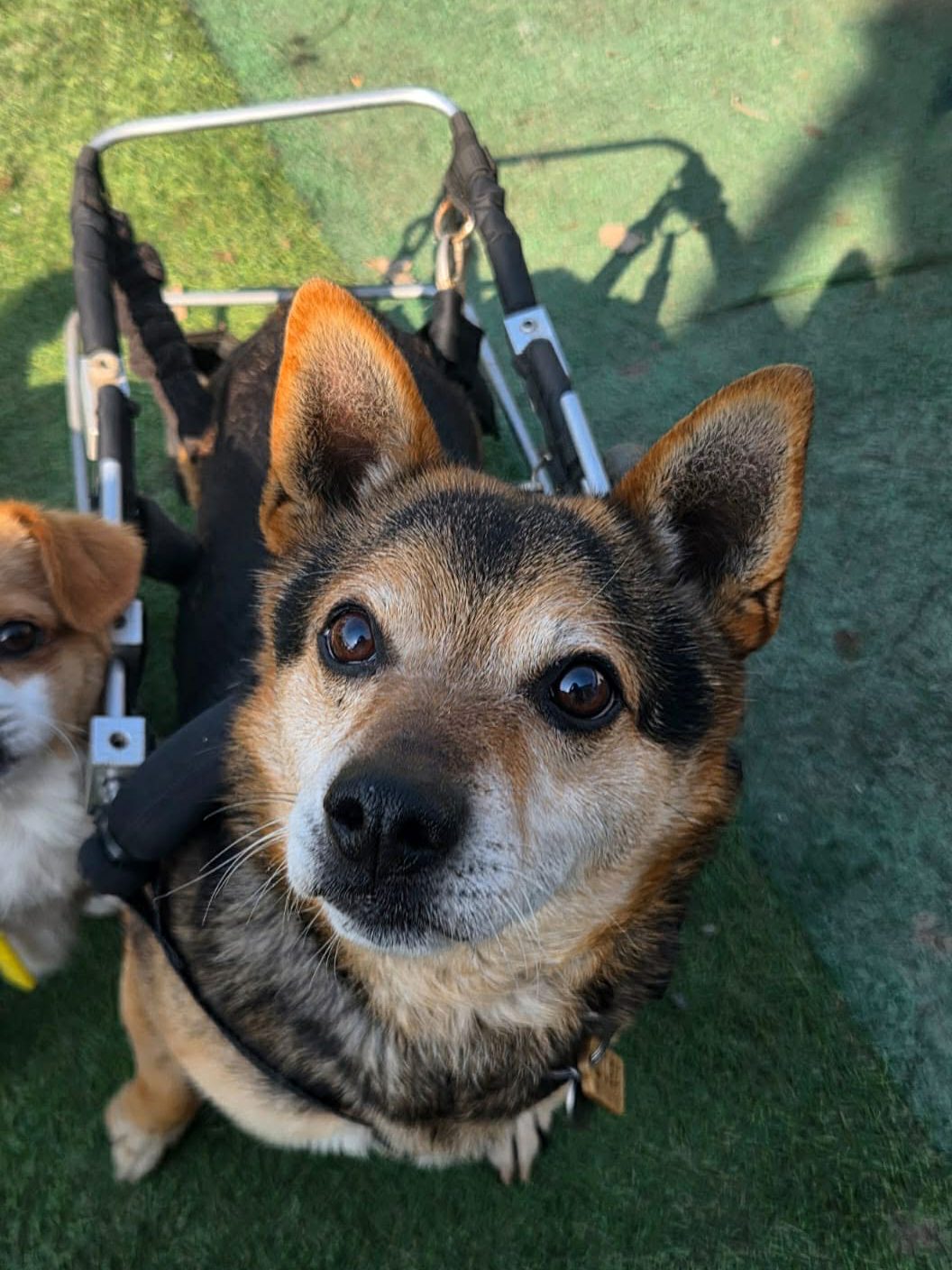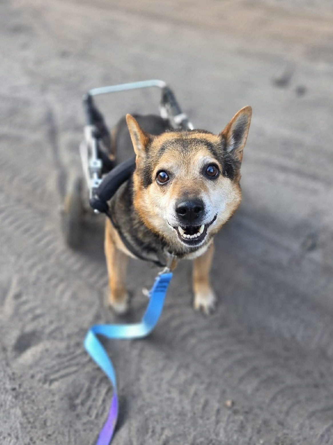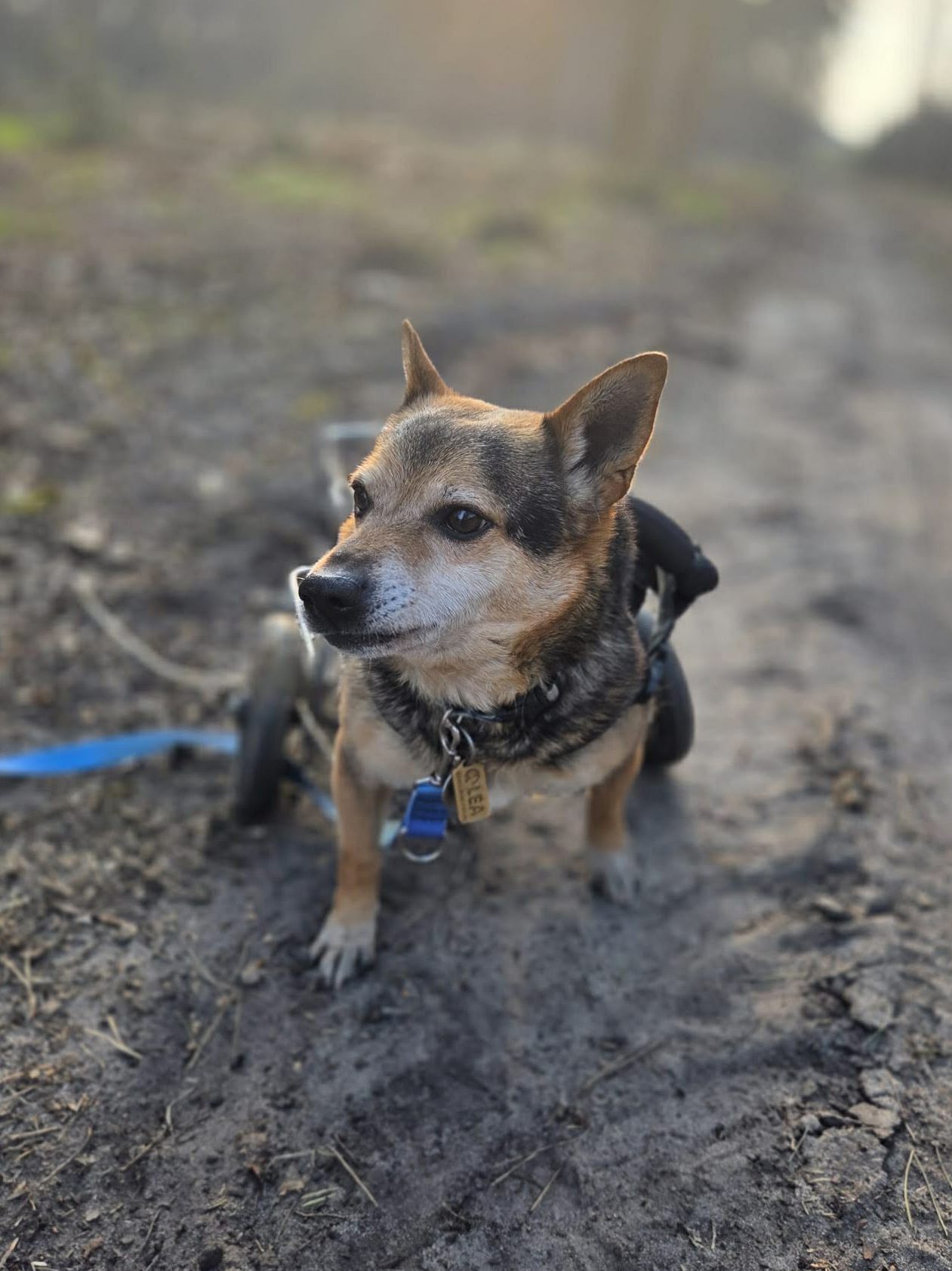 Krzysiu (zwany także Shermanem) przyjechał do nas z azylu w Kuflewie. Waży poniżej 10 kg, ma około 9 lat i… ogromne serce do życia! Choć jego tylne łapki nie działają, on kompletnie się tym nie przejmuje – śmiga na wózku jak prawdziwy mistrz Formuły 1. Spacer z nim to czysta radość (i niezły trening, żeby dotrzymać mu tempa).