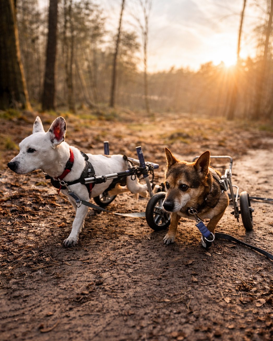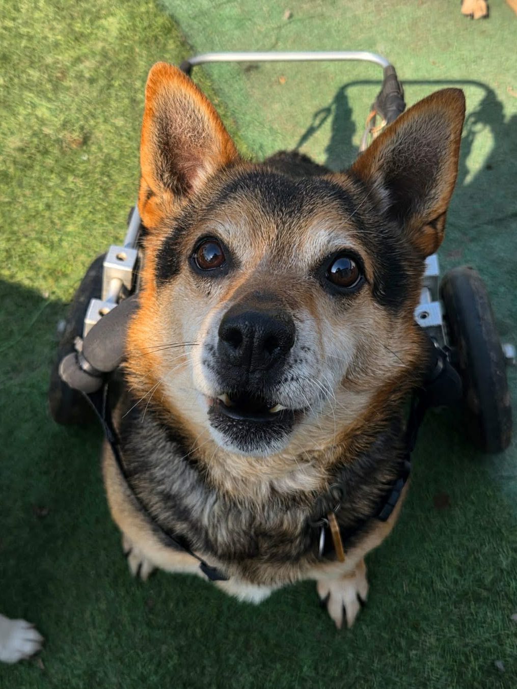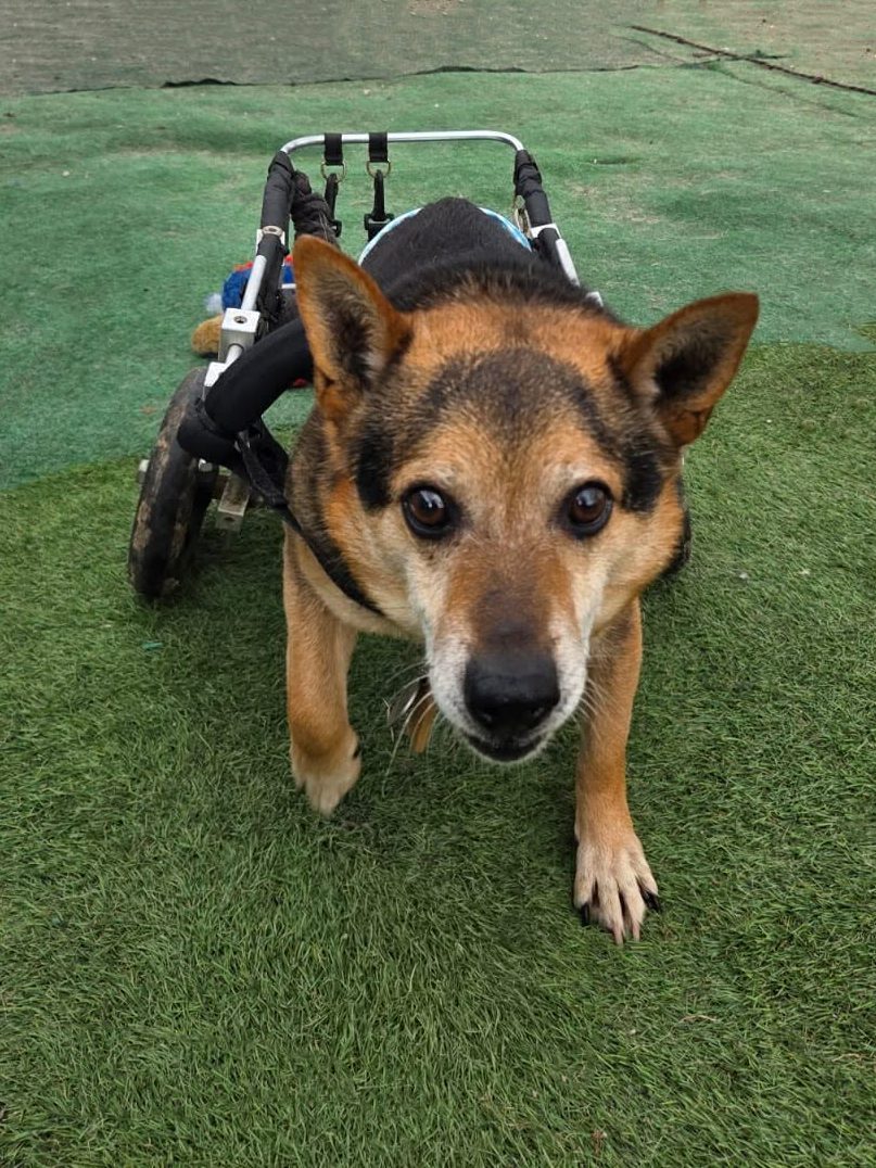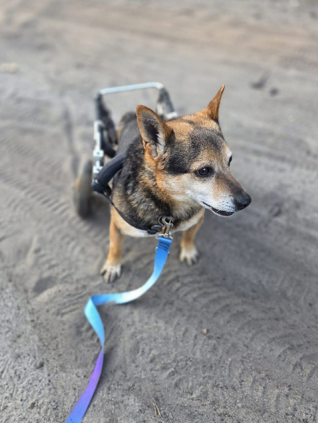 Krzysiu (zwany także Shermanem) przyjechał do nas z azylu w Kuflewie. Waży poniżej 10 kg, ma około 9 lat i… ogromne serce do życia! Choć jego tylne łapki nie działają, on kompletnie się tym nie przejmuje – śmiga na wózku jak prawdziwy mistrz Formuły 1. Spacer z nim to czysta radość (i niezły trening, żeby dotrzymać mu tempa).