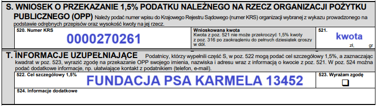 1,5% podatku dla Fundacji Psa Karmela jest przekazywane za pośrednictwem naszego partnera, Fundacji Studenckiej Młodzi Młodym i to jej nr KRS (podany powyżej) należy wpisać w zeznaniu podatkowym.